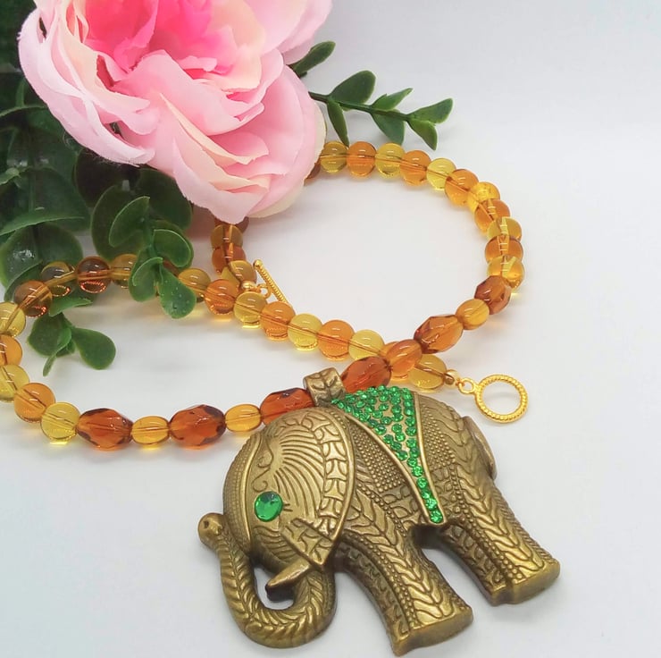 A stunning green rhinestone encrusted elephant pendant with a green crystal eye, measuring 50mm x 50mm suspended on a necklace made with 8mm amber and topaz coloured round