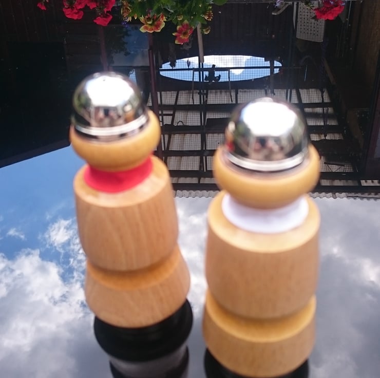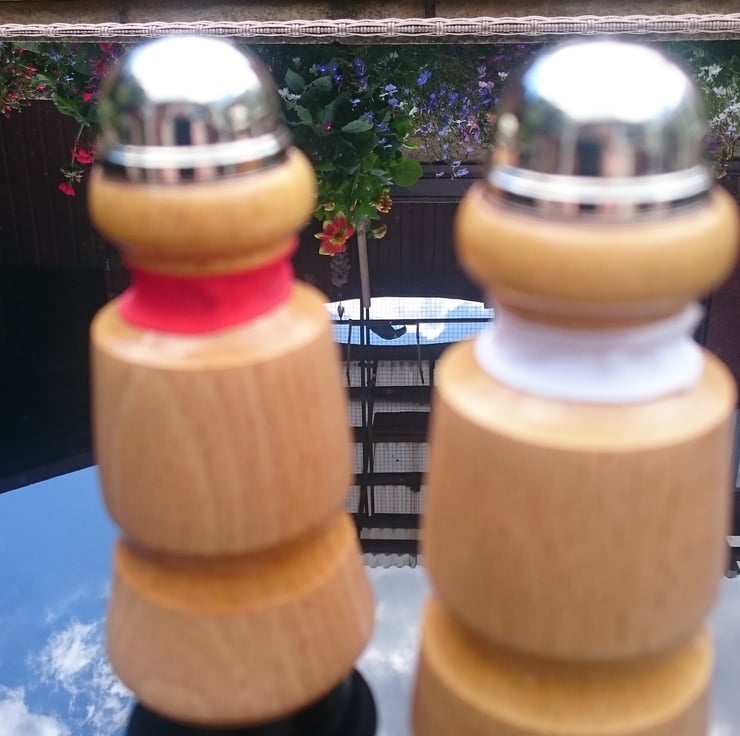 A simple but very different design with black base and coloured neck bands. This unique little set has solid Chrome tops which unscrew for easy refilling and avoid the old fashion plugs in the bottom. Measuring: 45 x 115mm