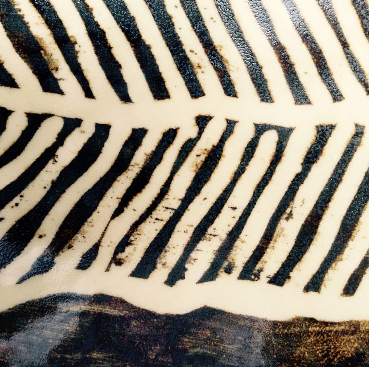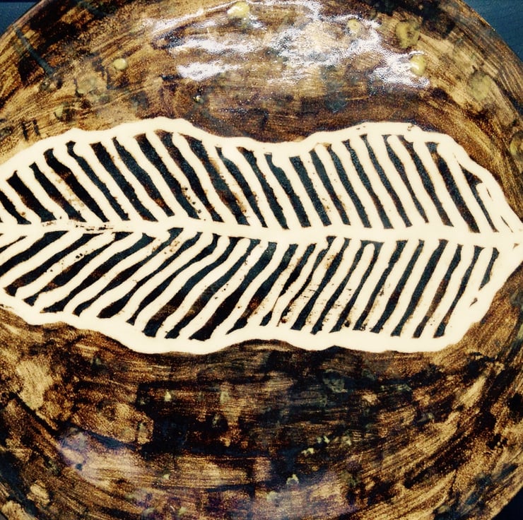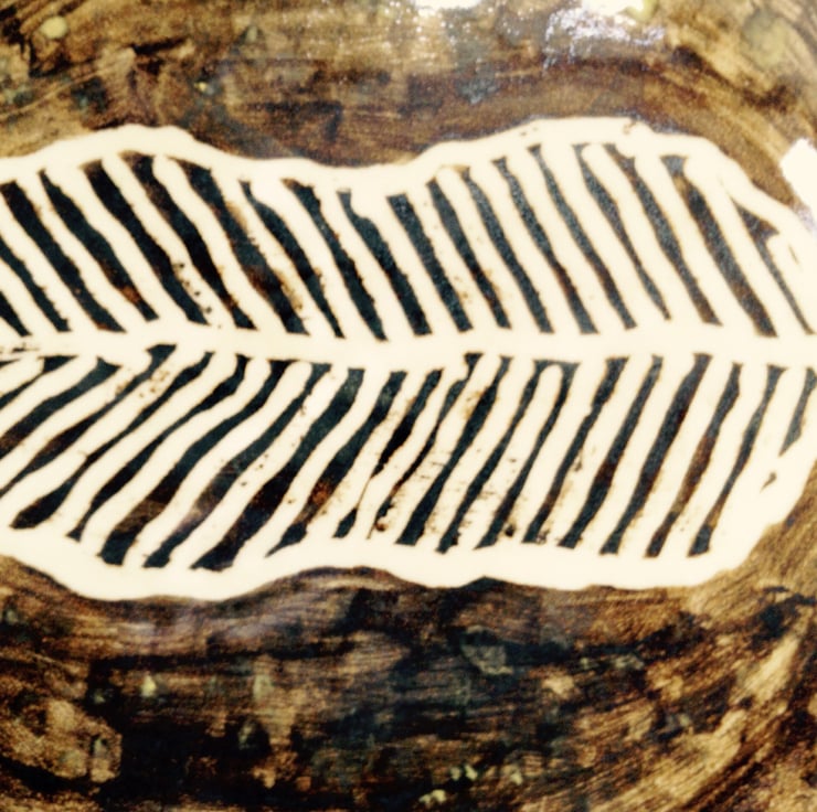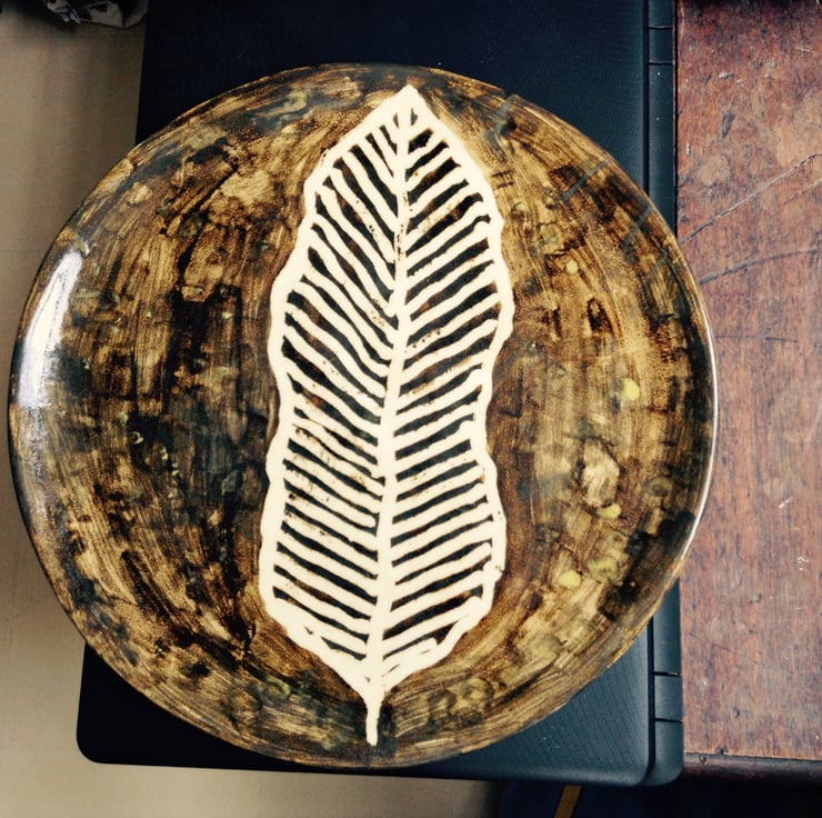 This lovely plate is decorated with a leaf design inspired by ancient rock paintings in Australia. I love the simplicity of these paintings and the natural earth colours used and I have decorated several of my pots with similar designs.
