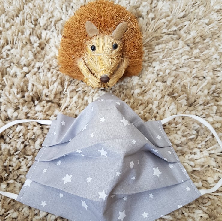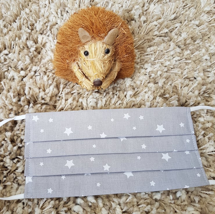 Small Adult/Teenager face covering made from a white star print on pale grey cotton. The face mask is made with 2 layers of cotton forming an inner pocket for a filter (not included) and is fastened over the ears with 2 loops of elastic and a toggle adjuster.