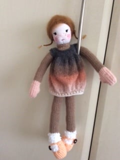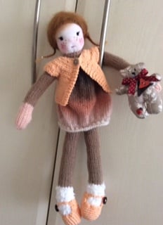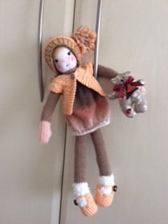 Saffron just cannot wait to meet her new best friend. She is a very pretty Waldorf type doll and measures approximately 40cm (15 and a half inches). She is hand knitted from various types of wool in shades ofApricot and Taupe. Her dress and cardigan are removable. Her shoes are crocheted in pale apricot cotton wool with pretty Brown button embellishments. She has a lovely embroidered face with a cheeky smile and button nose with lots of little freckles. Her chestnut mohair hair is in plaits with a pretty bobble hat in matching colours with a lovely fat tassel.