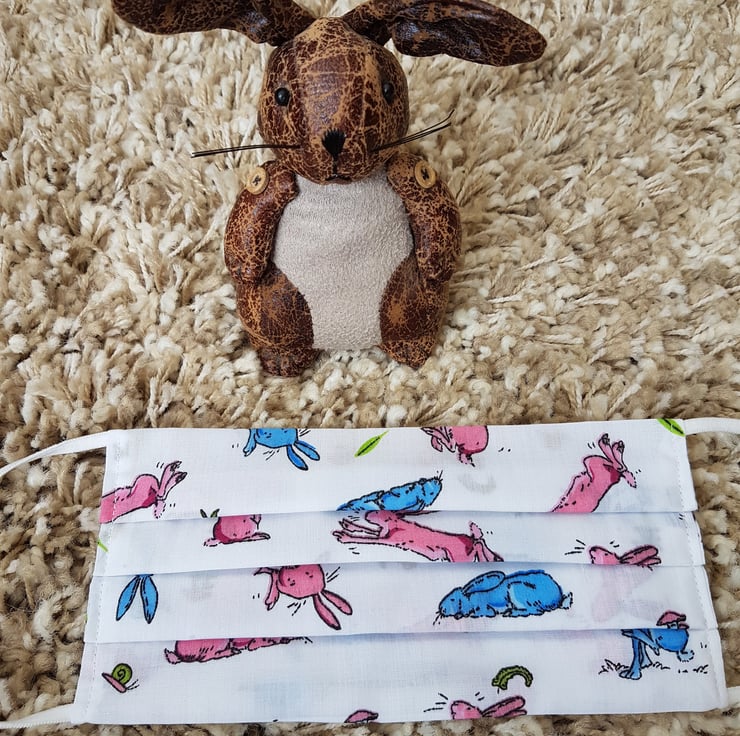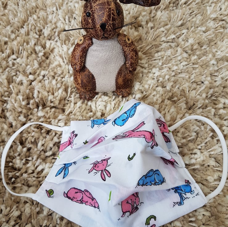 Adult face covering made from a pink and blue bunny print on white cotton. The face mask is made with 2 layers of cotton forming an inner pocket for a filter (not included) and is fastened over the ears with 2 loops of elastic.