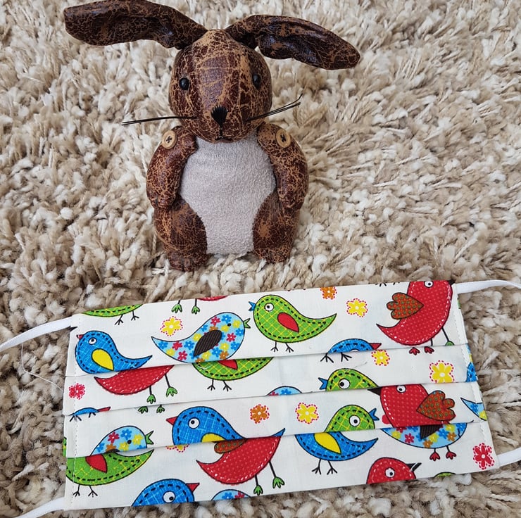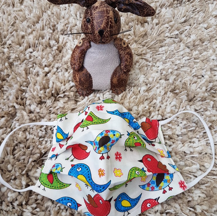 Adult face covering made from a patchwork bird print on cream cotton. The face mask is made with 2 layers of cotton forming an inner pocket for a filter (not included) and is fastened over the ears with 2 loops of elastic and a toggle adjuster.