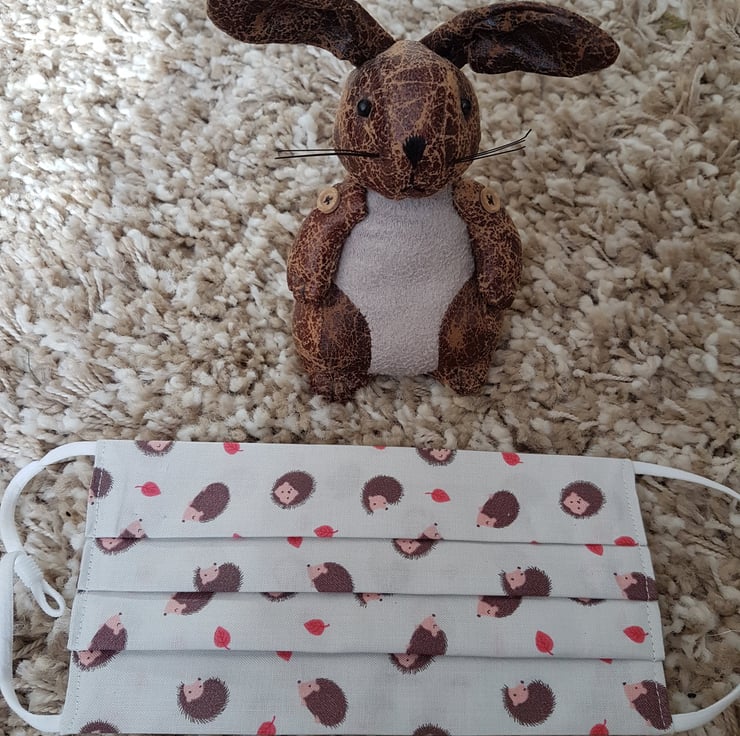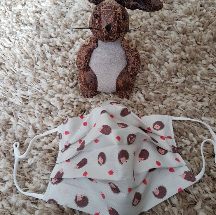 Adult face covering made from a hedgehog and leaft print on cream cotton. The face mask is made with 2 layers of cotton forming an inner pocket for a filter (not included) and is fastened over the ears with 2 loops of elastic and a toggle adjuster.