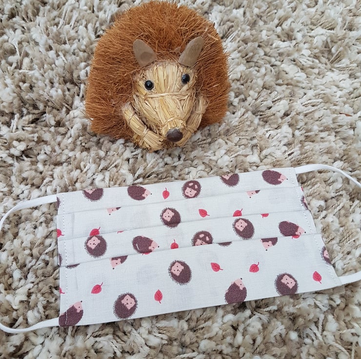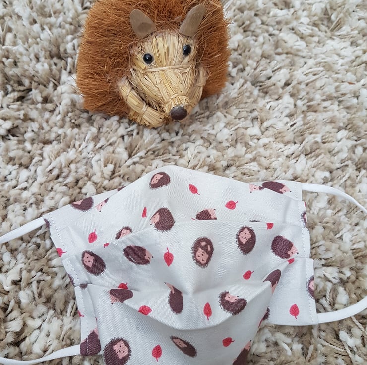 Small Adult/Teenager face covering made from a hedgehog and red leaf print on cream cotton. The face mask is made with 2 layers of cotton forming an inner pocket for a filter (not included) and is fastened over the ears with 2 loops of elastic and a toggle adjuster.