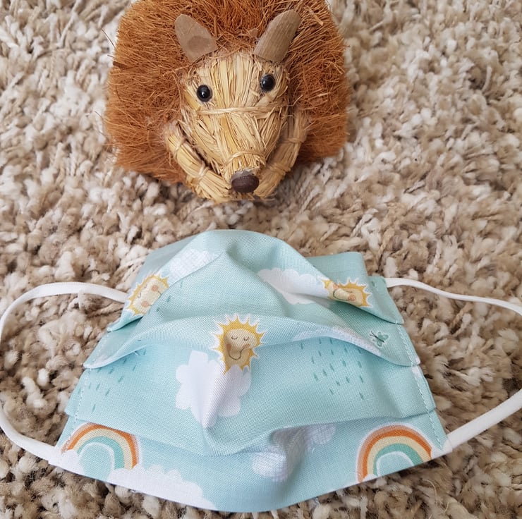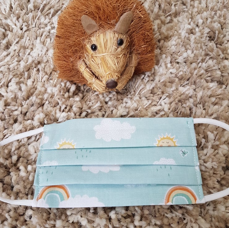 Small Adult/Teenager face covering made from a Rainbow print on mint cotton. The face mask is made with 2 layers of cotton forming an inner pocket for a filter (not included) and is fastened over the ears with 2 loops of elastic and a toggle adjuster.