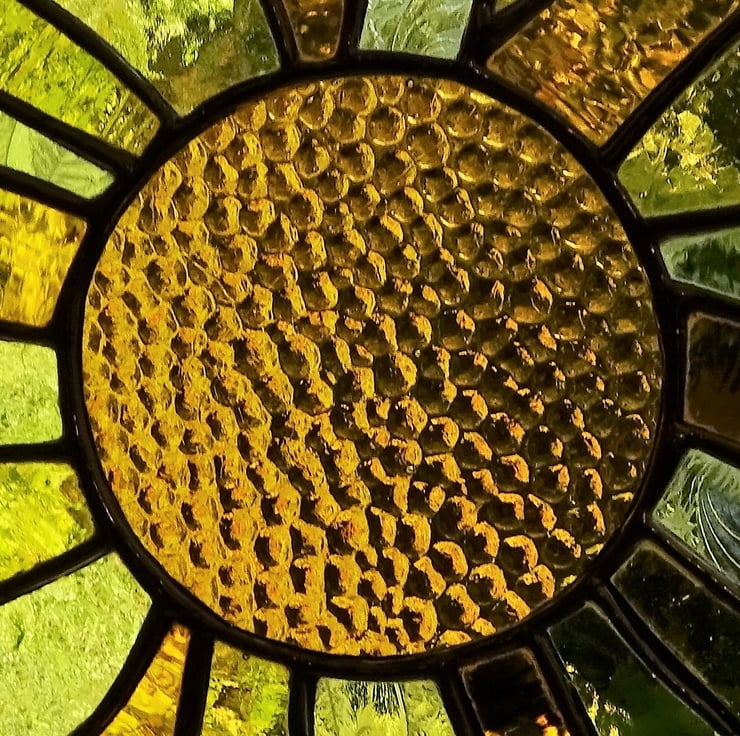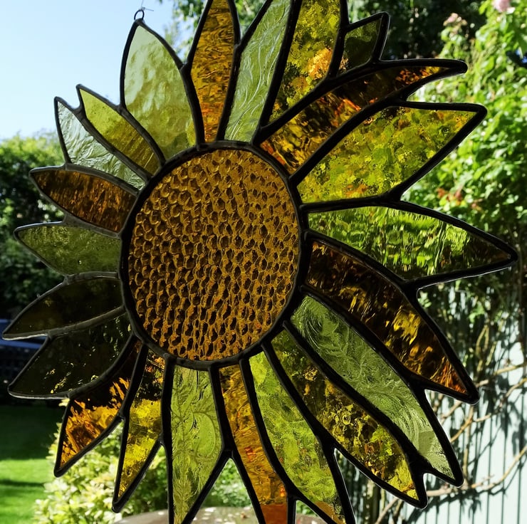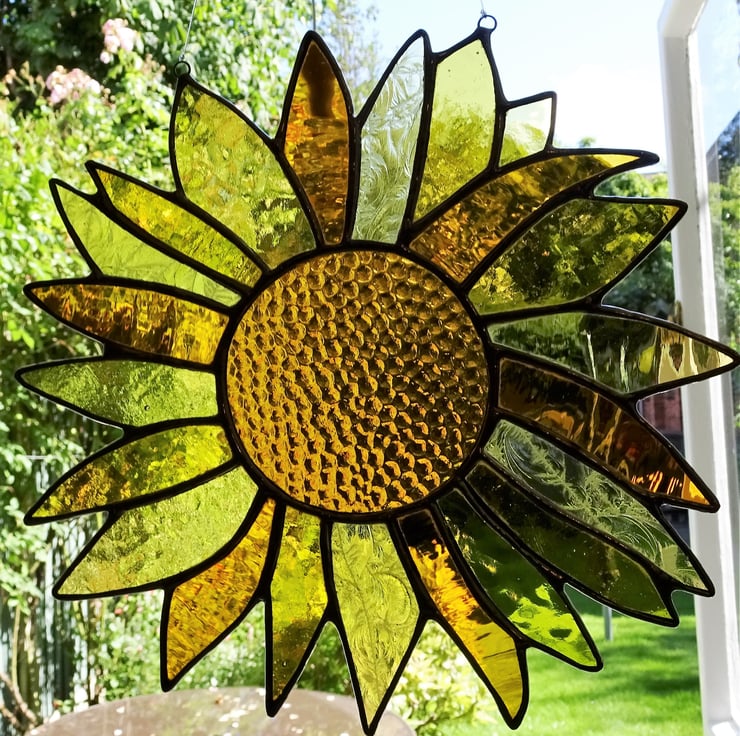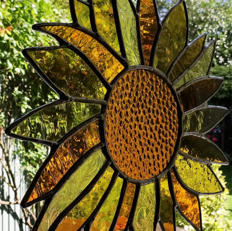 This beautiful stained glass sunflower will remind you of Summer all year round. Hand-crafted using the Tiffany method of stained glass making. Each piece of glass is hand cut and shaped. The edges of the glass are wrapped in copper foil which is burnished to the glass. The petals are then soldered together using a fine beaded solder line. The centre of the sunflower is made from amber hammered glass which is textured. The petals are cut from a range of amber, yellow and gold glass including Water glass, Glue Chip glass and English Muffle glass. The light catcher comes with a hand tied loop and is ready to hang in a position. A unique hand-crafted gift for any occasion.