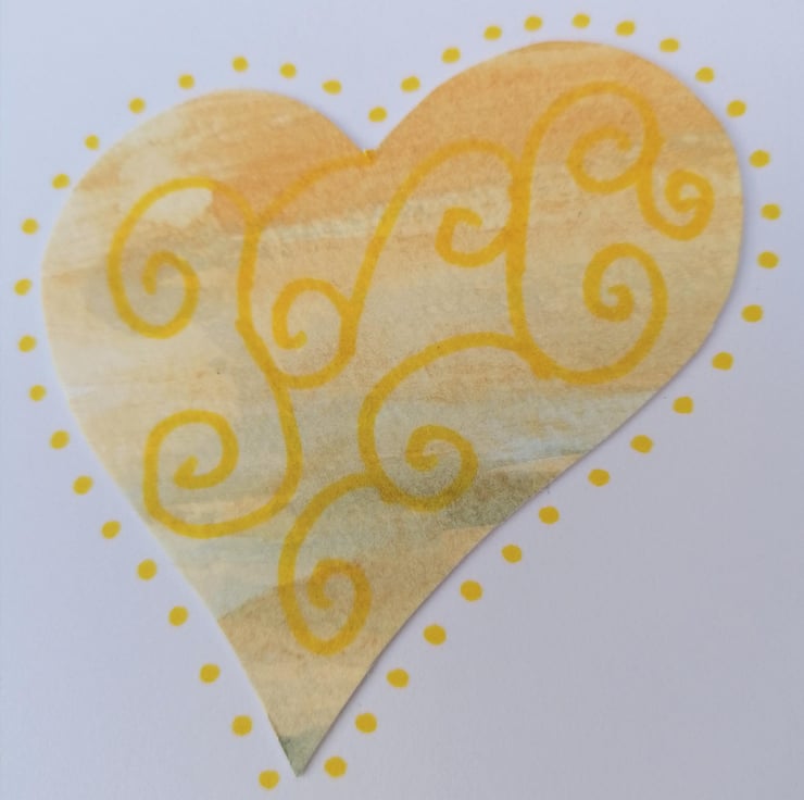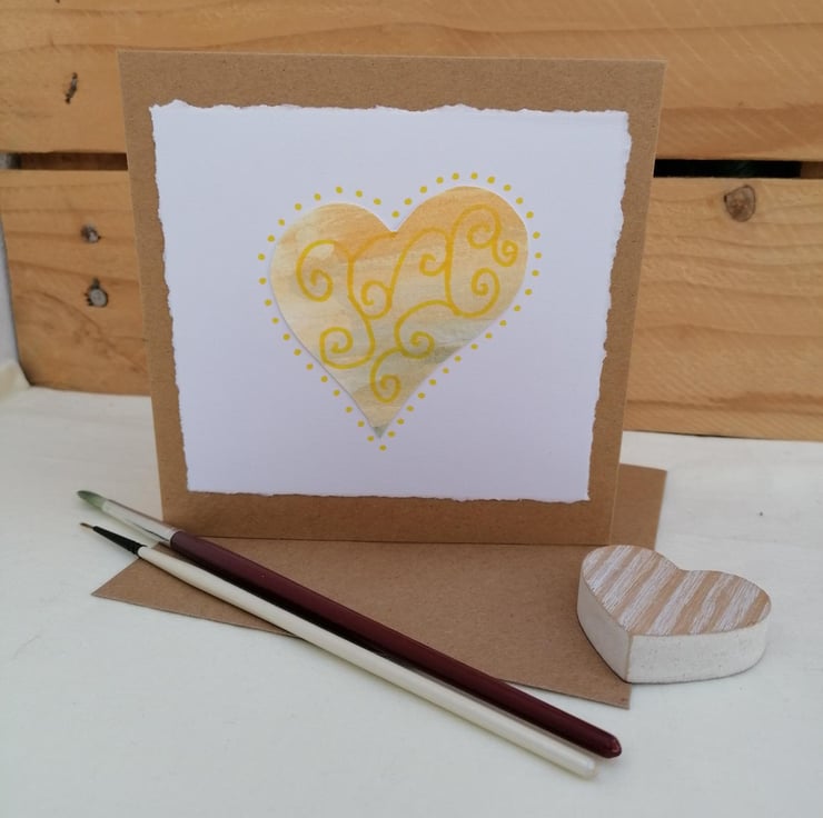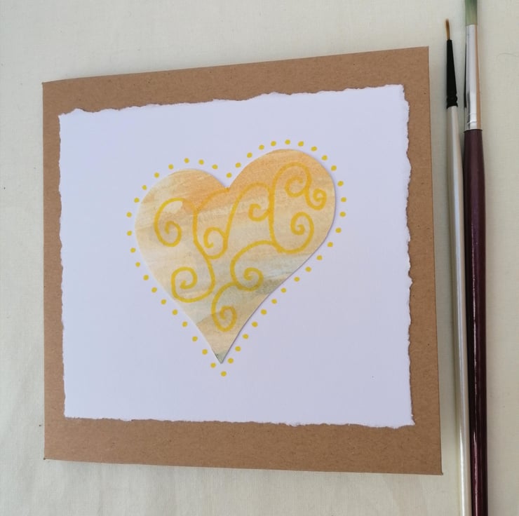 I have cut out the individually drawn heart shape from my watercolour painting, featuring a golden sky. The heart is attached to recycled card stock to create a romantic greetings card, ideal for anniversaries or special occasions.