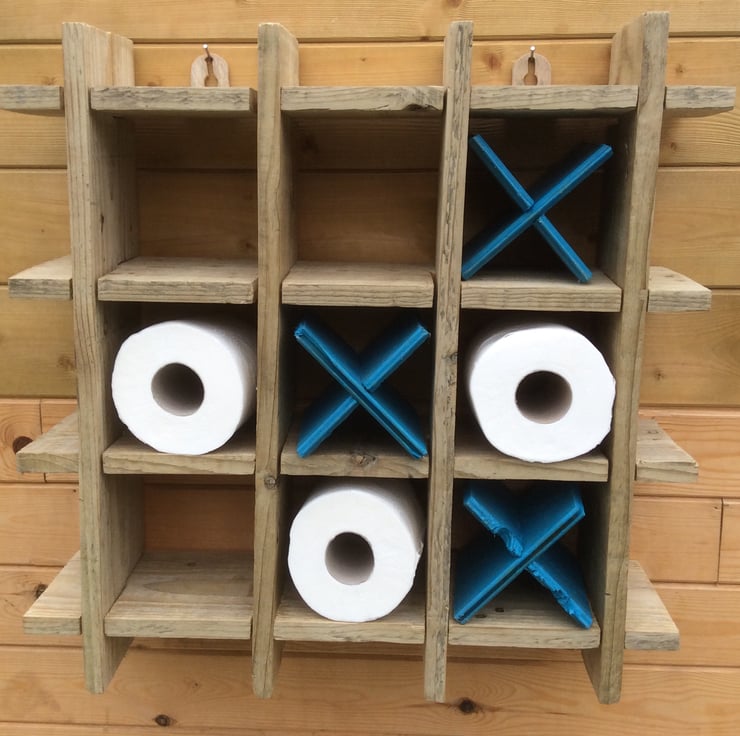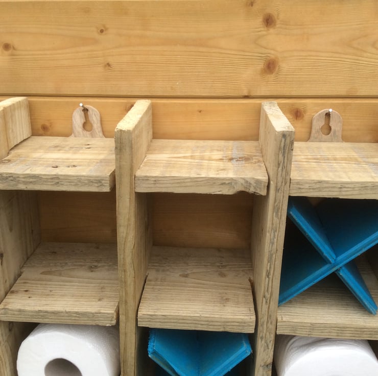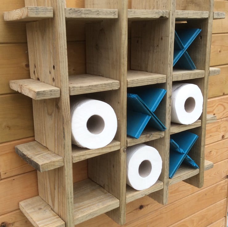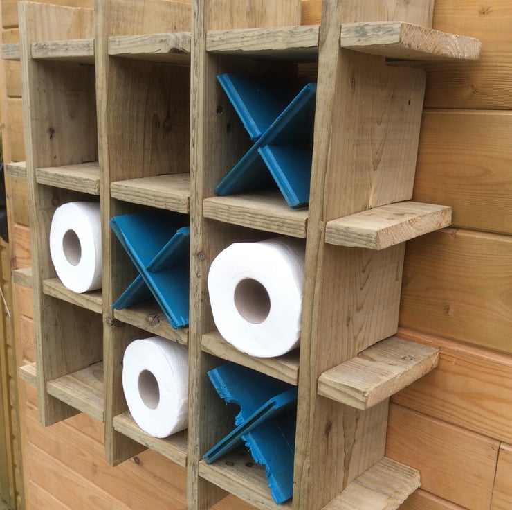 Quirky, fun yet functional toilet roll holder allowing six rolls to be displayed. Made from up-cycled wooden fence pieces.