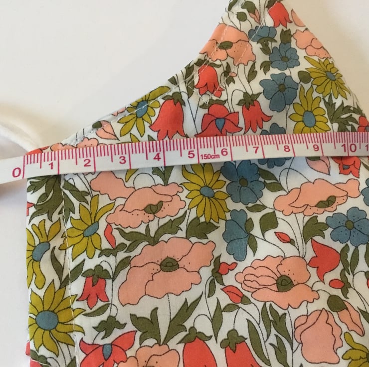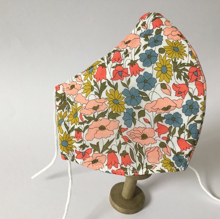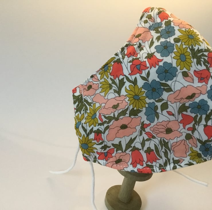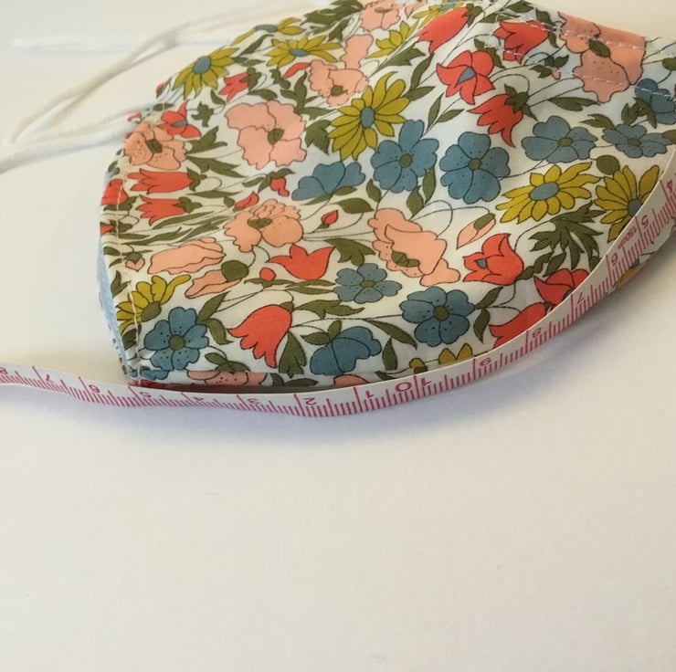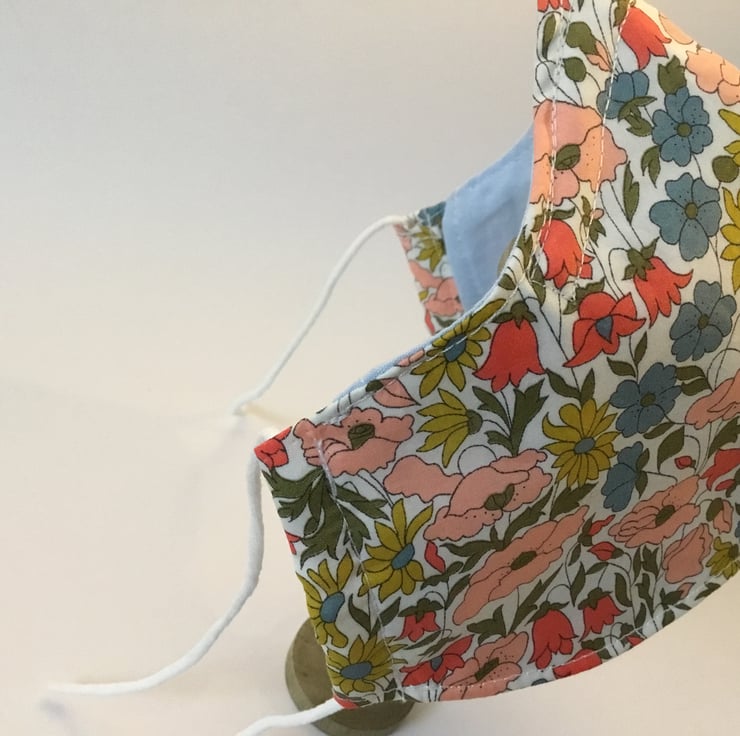 Liberty Floral face covering with removable nose wire and elastic ear loops with 30cm each side for you to adjust to size. The covering has 3 layers of cotton fabric with a soft blue cotton lining.