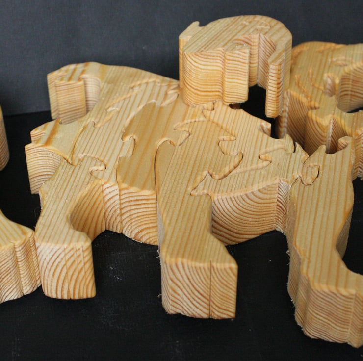 A piece of recycled wood was cleaned and sanded to enable me to upcycle it. The design was applied to the wood and cut using a Scroll Saw. The puzzle was then assembled and disassembled to ensure that all the pieces fitted together smoothly. Each piece was lightly sanded all around to give them a slight round over effect. It was then coated in Danish Oil and buffed to a smooth finish.