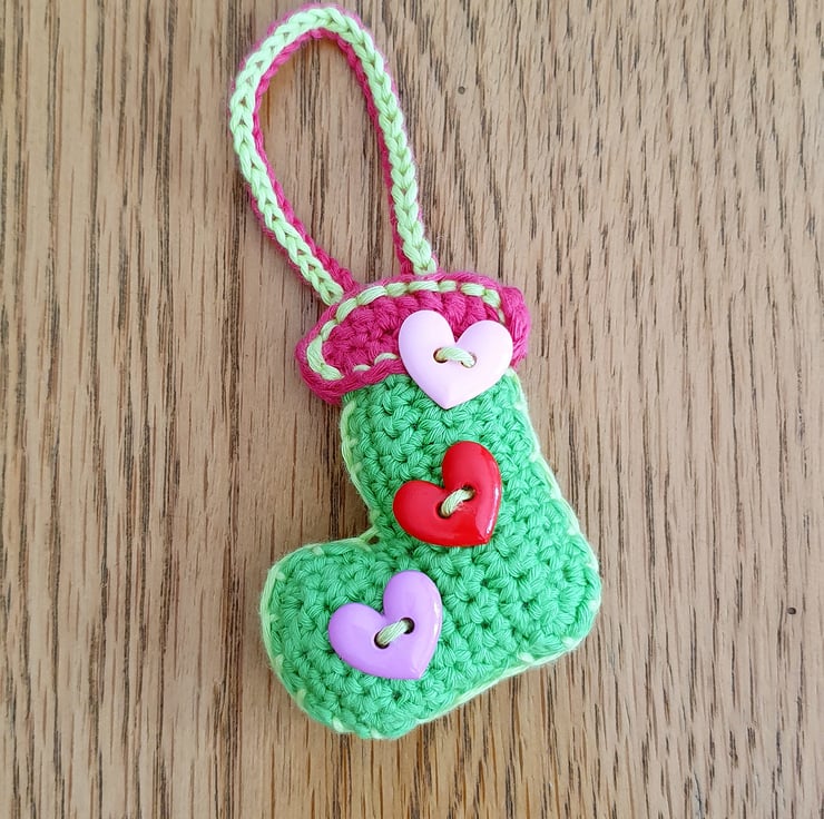 This particular stocking is green with a pink trim and lime green edging. It is finished with 3 pretty heart buttons.