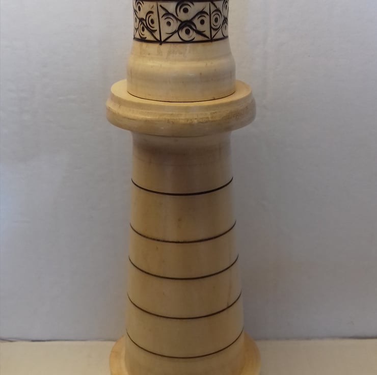 Constructed using 3 separate sections with the solid base and tower giving a chunky tactile feel to this purely ornamental lighthouse. The wood for this came as a wind fall branch from our local copse discovered by my faithful chocolate Lab Cara (hopefully I managed to turn all of the teeth marks out).
