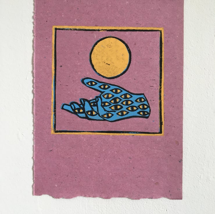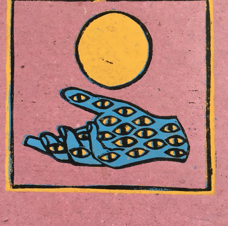 A graphic reduction print of a mythical hand covered in eyes embracing/releasing a sun like orb.