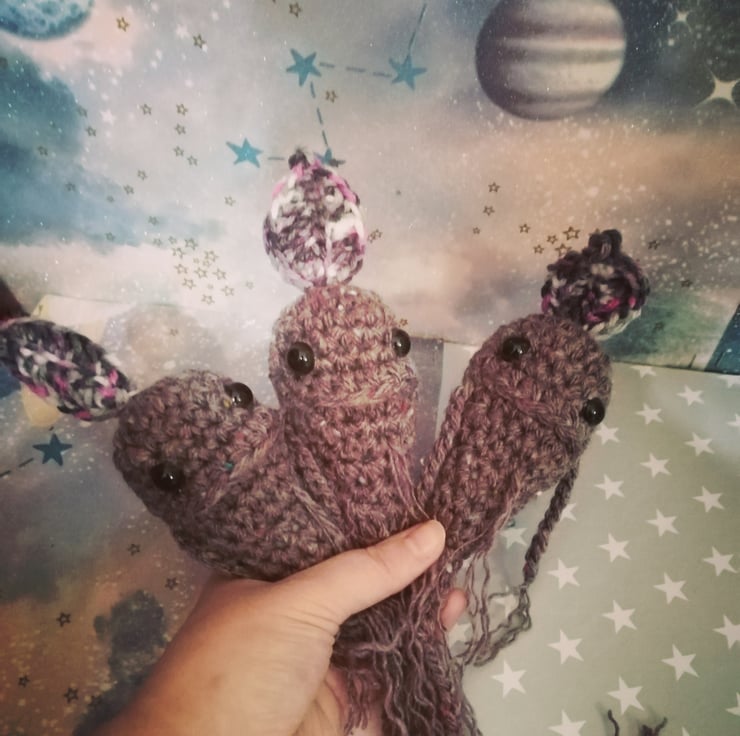 These limited edition seedlings are made out of a lovely mottled Heather coloured yarn. With a purple / grey leaf.