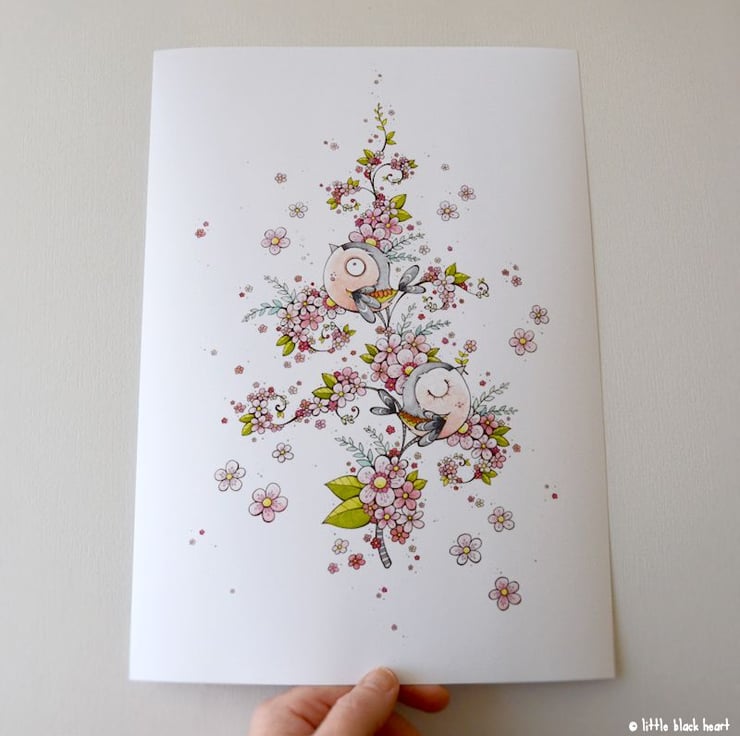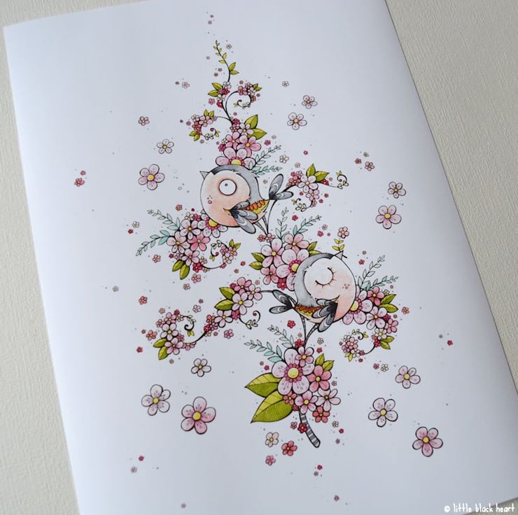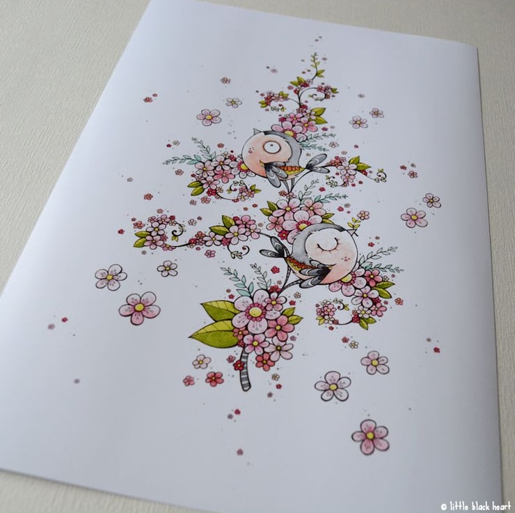 a sweet pair of spring birds, enjoying the fresh blossom and colours of the season.