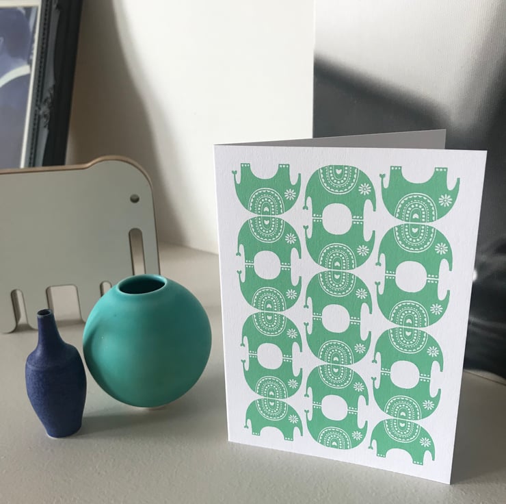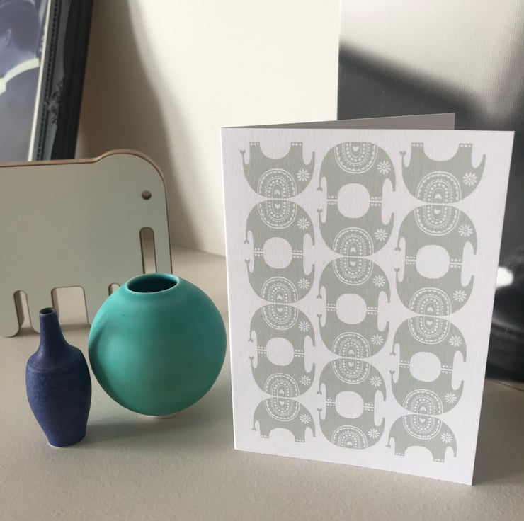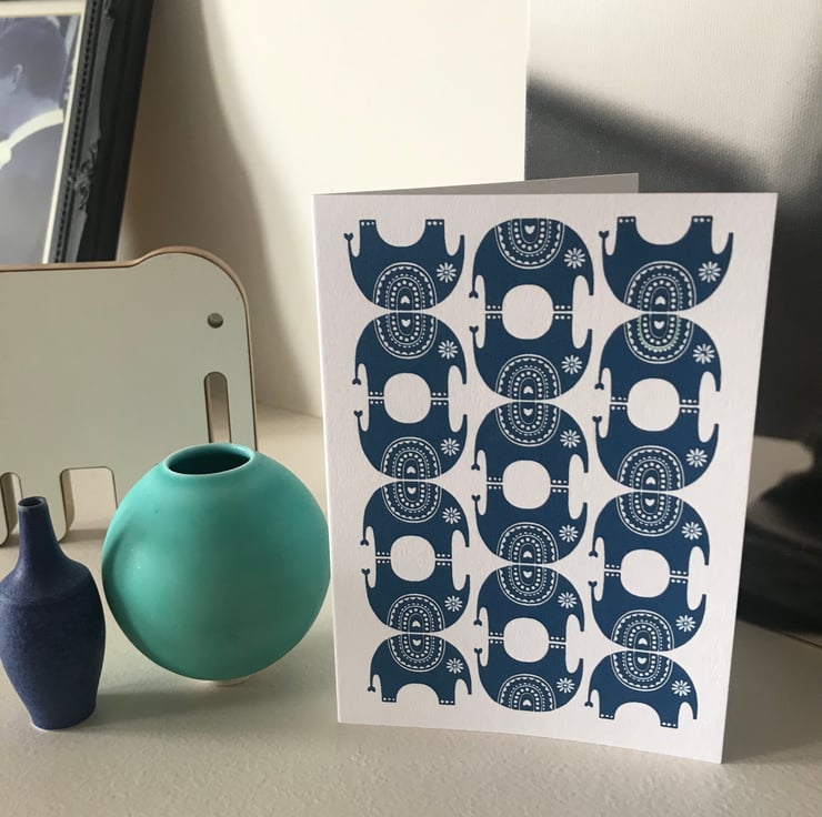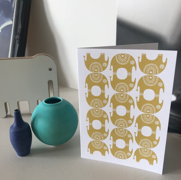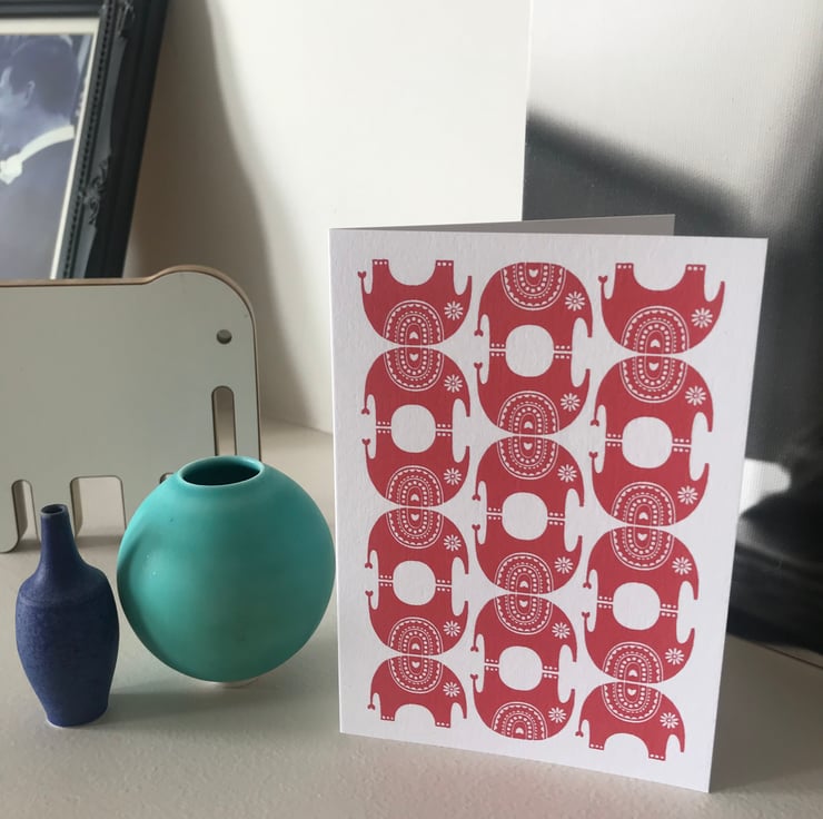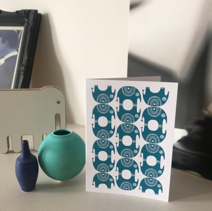 All my designs are Inspired by Scandinavian and mid century pattern and colour. I love the simplistic aesthetic and try to create this in my work. My idea for this 'Little Elephant' design came from the repeat one colour patterns you so often see in Indian pattern design. This alongside the fabulous strong vibrant colours you see within India culture really sparked an idea in my head. This little fellow has actually been sat in my sketchbook for a while and thanks to a bespoke request from a loyal customer for an elephant card I finally got him out of the sketchbook.
