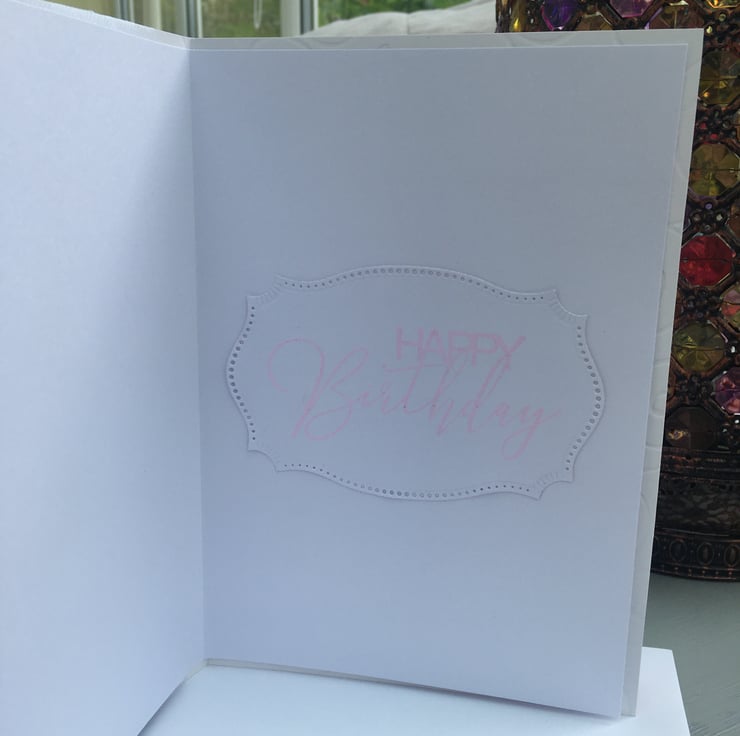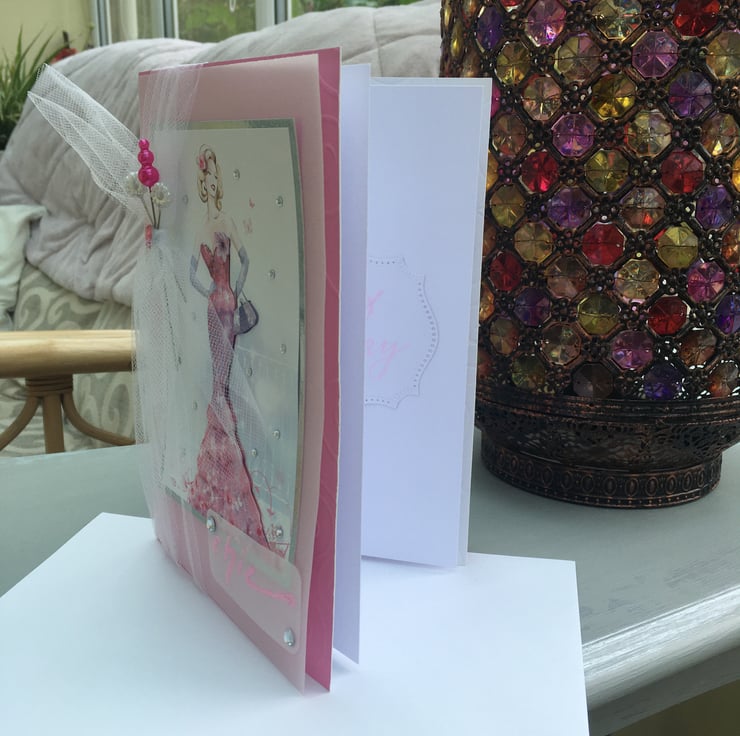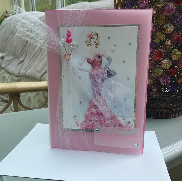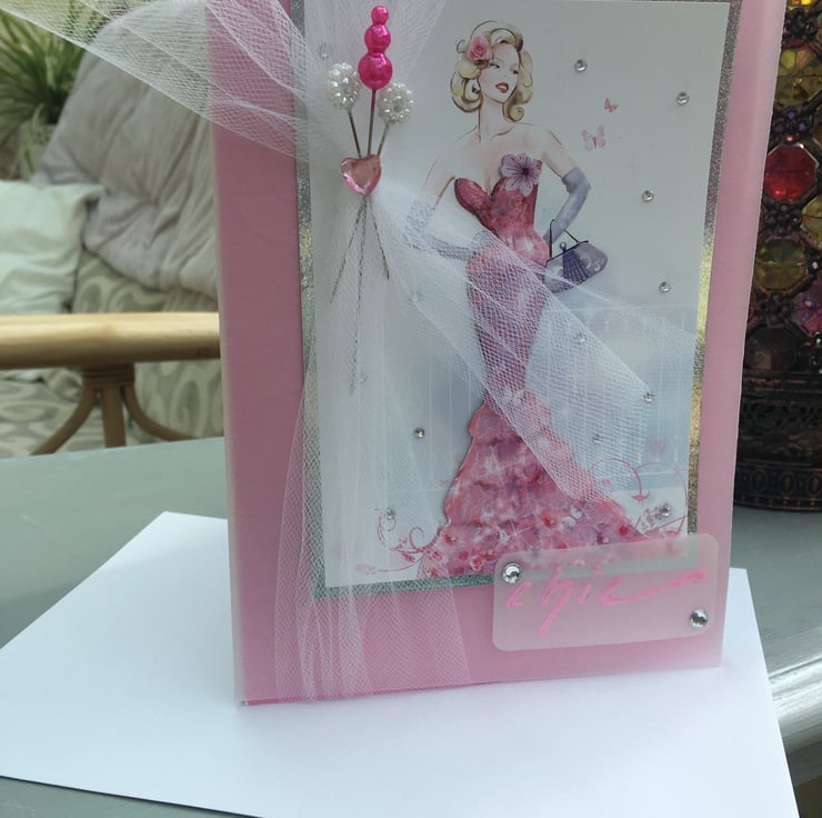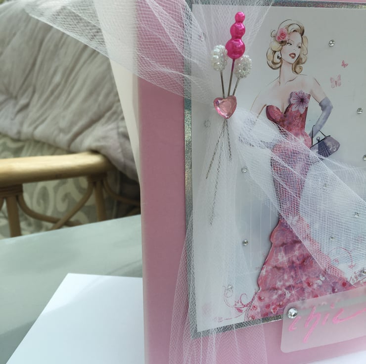 This is an unashamedly pink and feminine card. It is multi-layered with a luxury insert and vellum wrap. The main card is pink swirl embossed card. This is layered with a white vellum wrap. The main image is a very glamorous lady in a pink frilled dress, wearing long gloves and holding a matching handbag. This is mounted on fine silver holographic card to make the image pop. This is placed on the vellum. A tulle ribbon is tied around the card leaving 2 long tails. The knot is embellished with 3 hat pins, 2 flowers and the other is a bright pink top. A sparkly pink heart finshes this. The main image is scattered with gems and the sentiment says Chic. There is an insert with the greeting Happy birthday in the palest of pink on a fancy label. This is approximately A5 in size and comes with a white envelope.