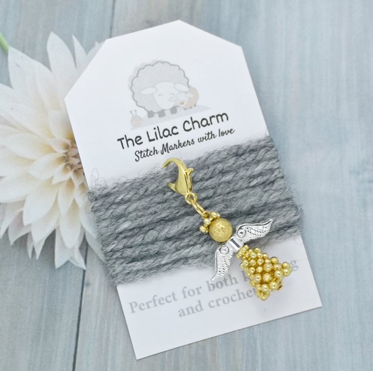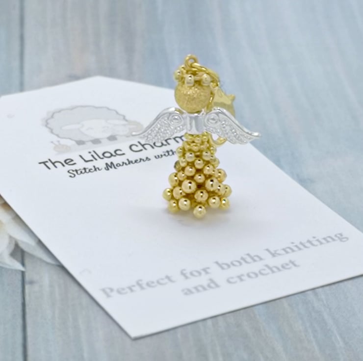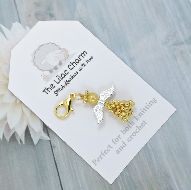 The stitch marker is made of Gold Sparkle Spacers in 12mm, 10mm, 8mm, 6mm & 4mm. Gold Glitter Bead, Silver Plated Angel Wings.