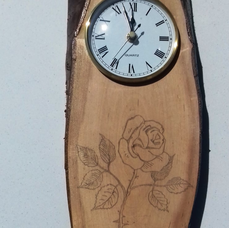 10cm brass rim glass front quartz clock insert mounted in a live edge varnished plaque decorated with a printed rose. This clock would look good on any living room wall.