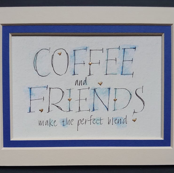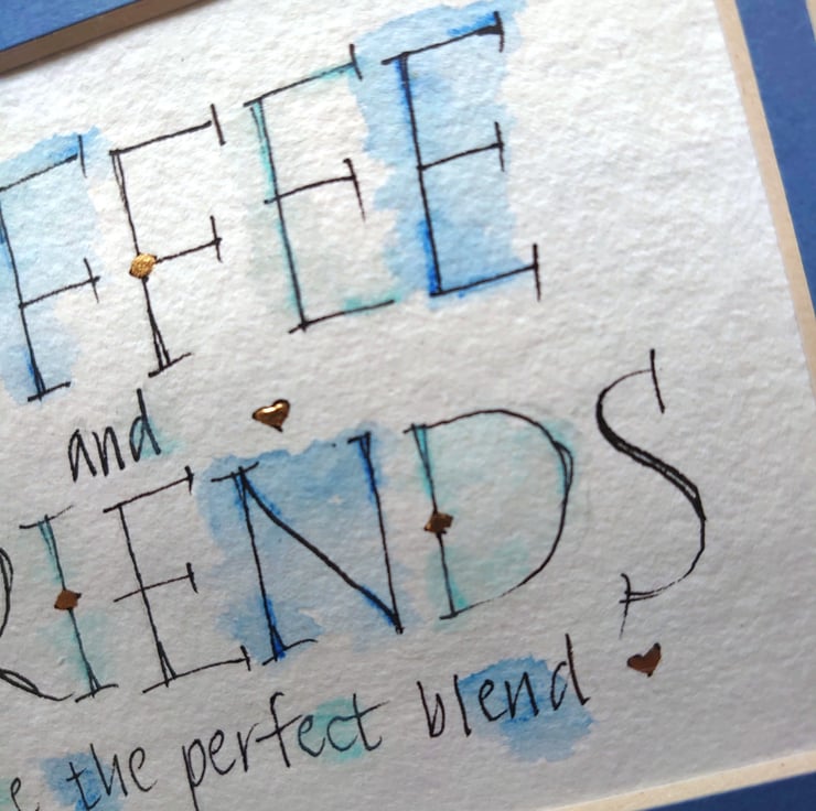 Coffee and Friends giclée print, fine black letters with pale and dark blue watercolour highlights and 23c gold leaf within a 125 x 175mm (5 x 7") double ivory mount, or inside a double mount with a mid-blue inner line