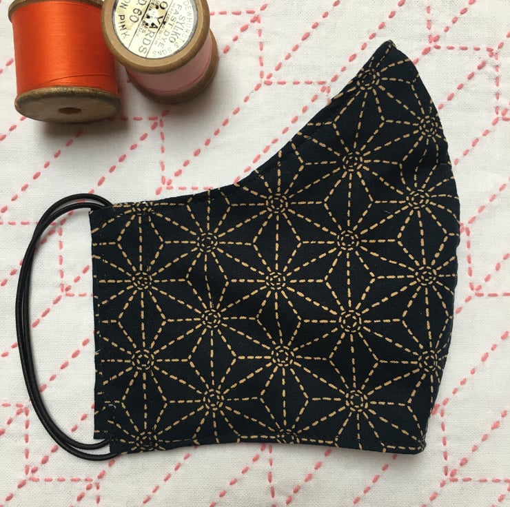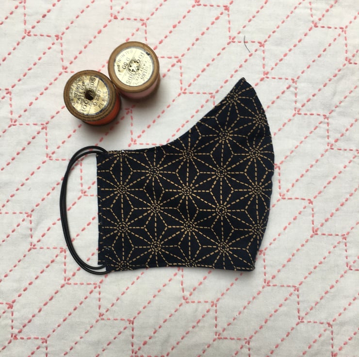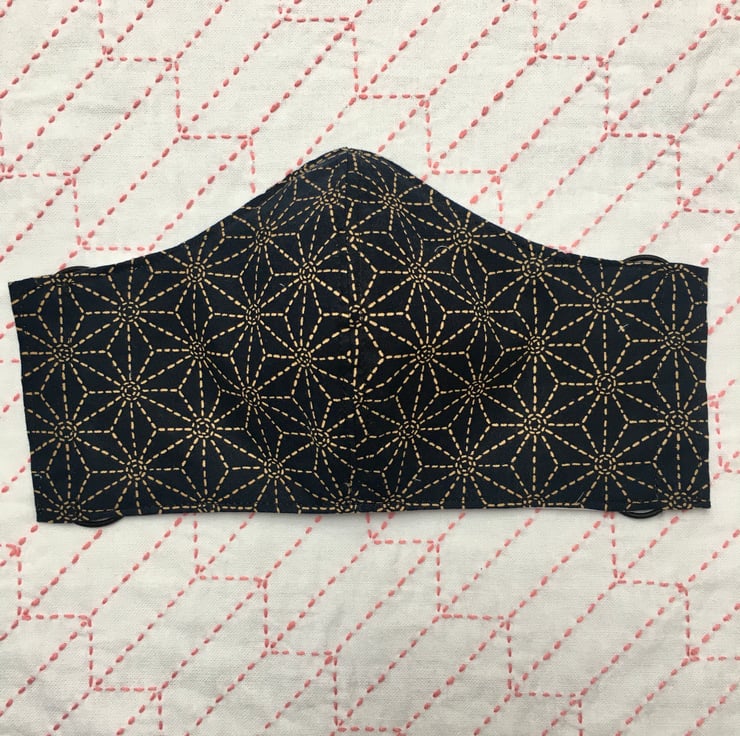 Asanoha is a traditional Japanese pattern and means hemp leaf. The pattern creates a stylish and fashionable mask with the indigo and beige colours. The fabric is high quality cotton. The mask is lined with at least a 400 thread count cotton, which is extremely soft against the skin. The mask is washable & reusable.