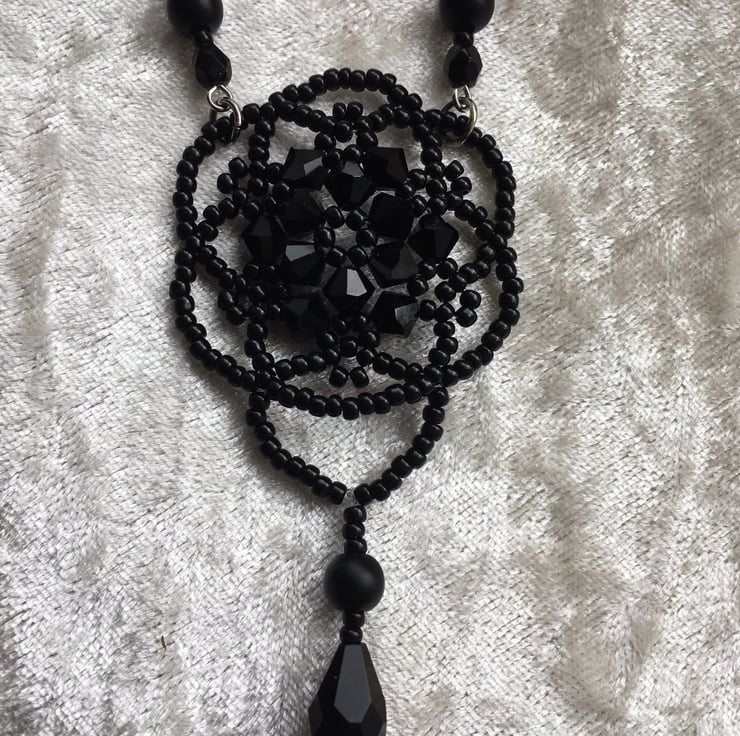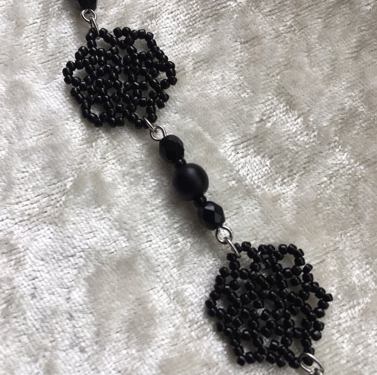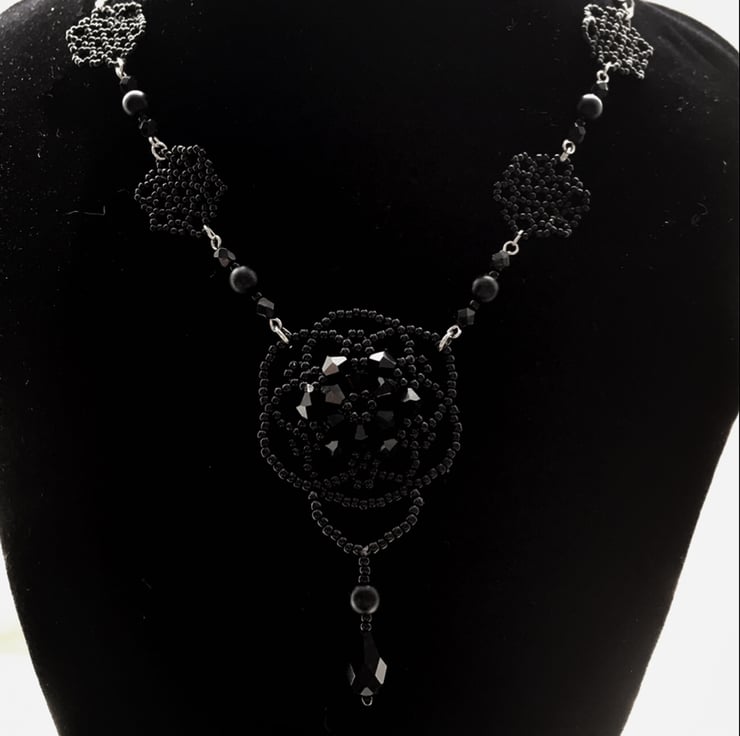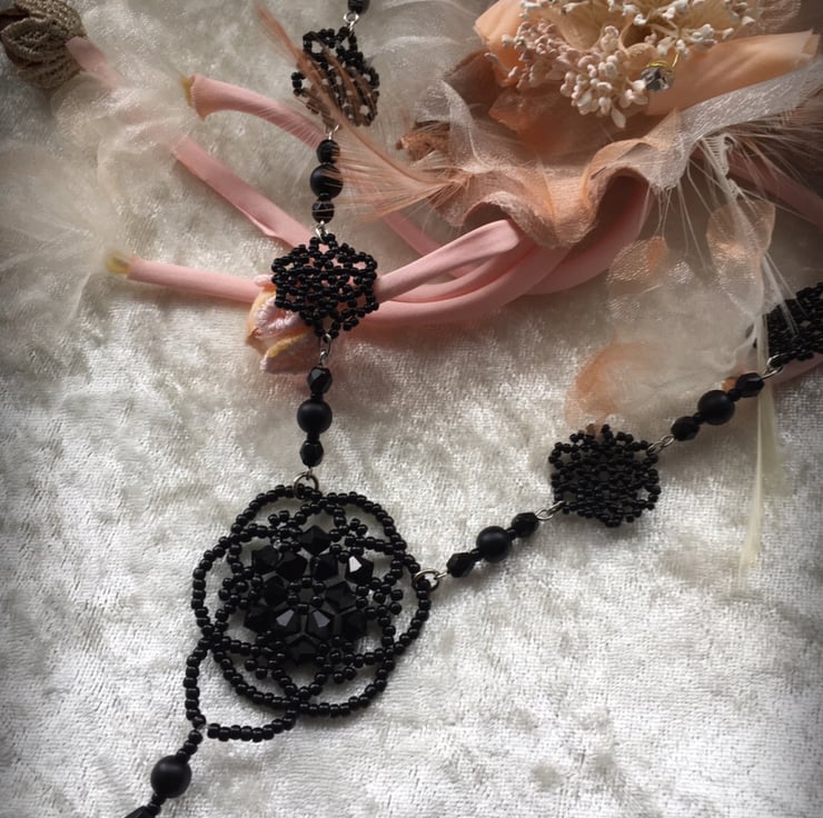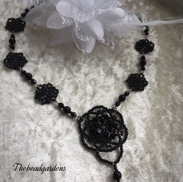 This necklace feature is a black beaded flowers(1.5cm) that are made by hand sawing like crochet with seed beads. For the top(4cm), it’s the same way of beading but I used some big Swarovski crystals to attract. Also I used black Czech glass beads and mat round black beads to connect.