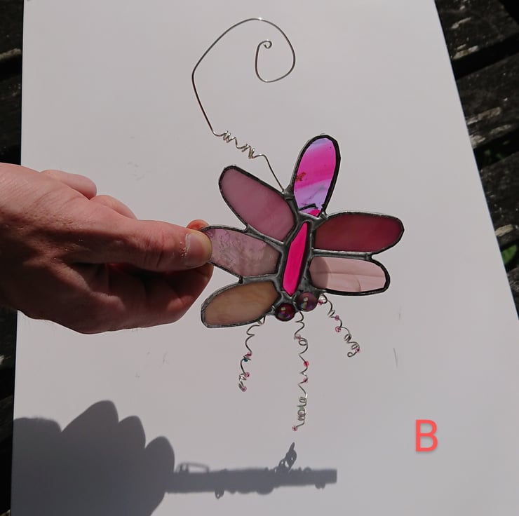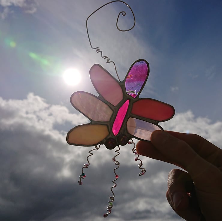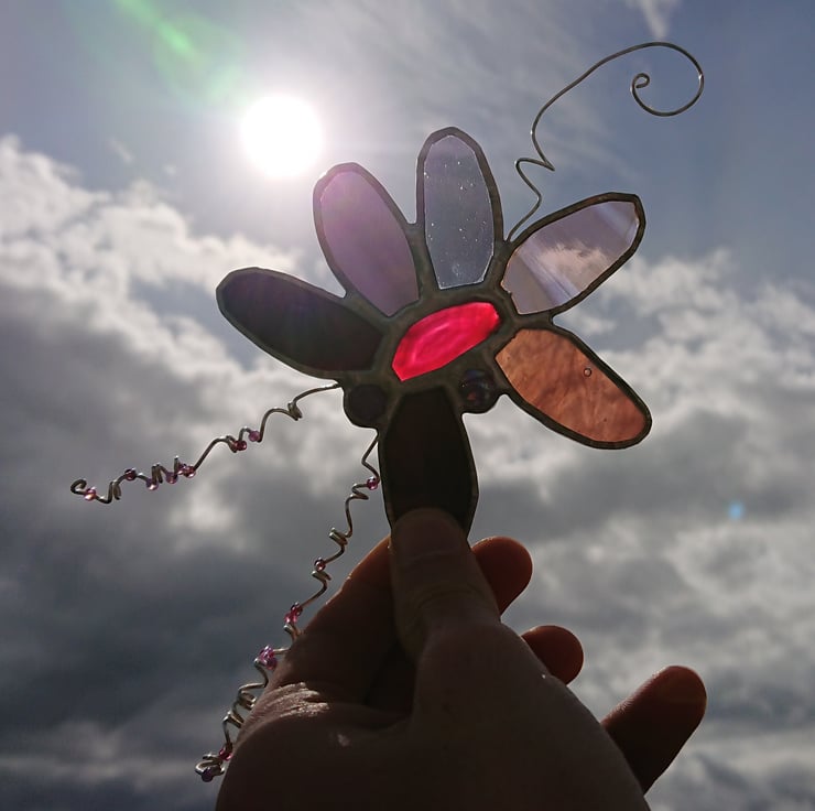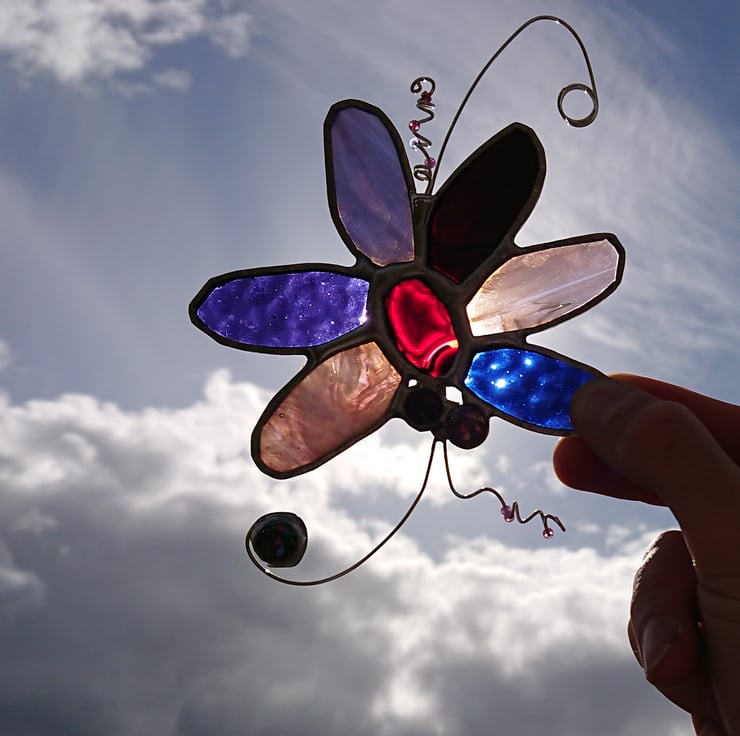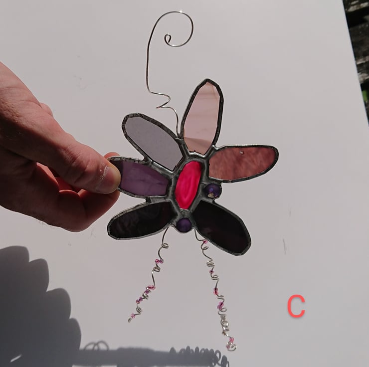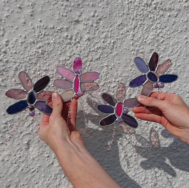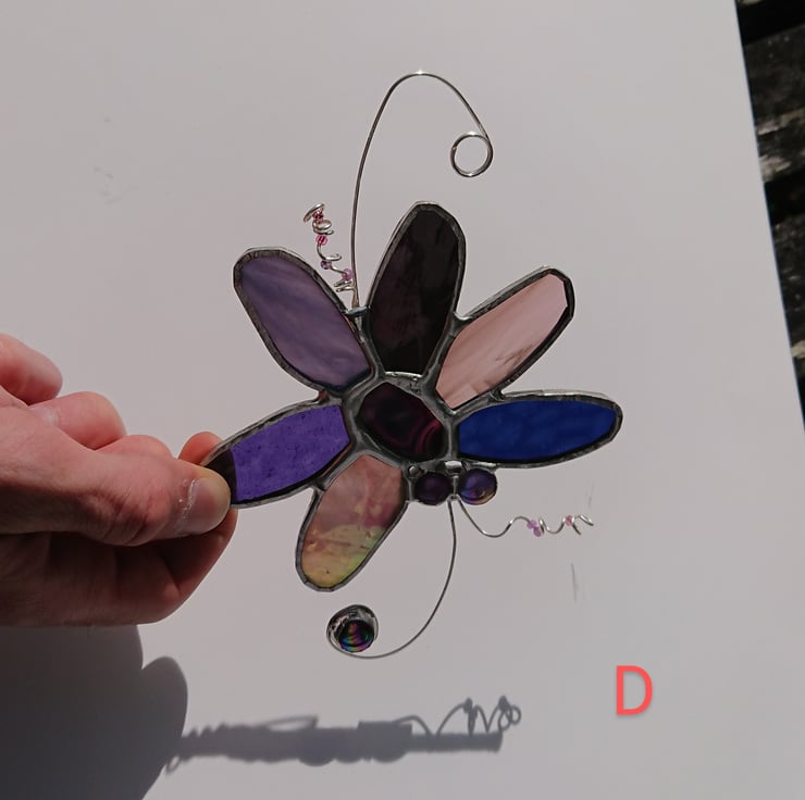 These decorations are built around small agates. Surrounding each one I have selected six pieces of stained glass for the 'petals' and added some glass nuggets and silver plated twisted wires with glass beads.