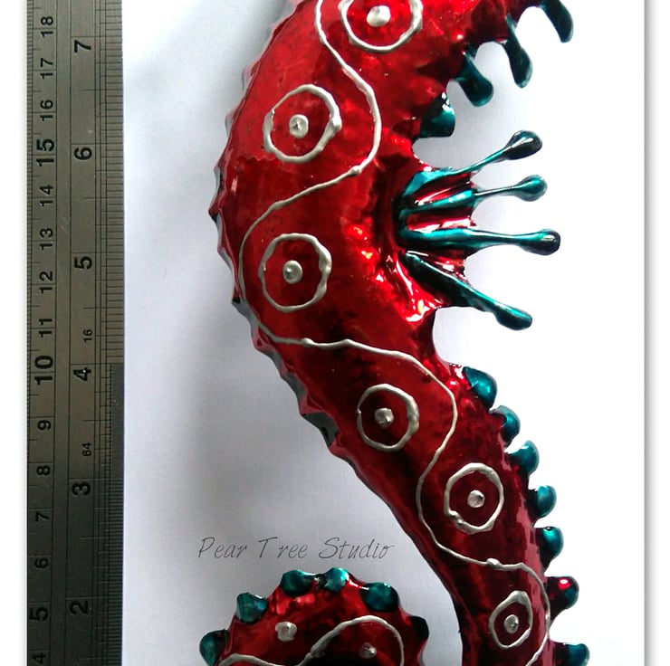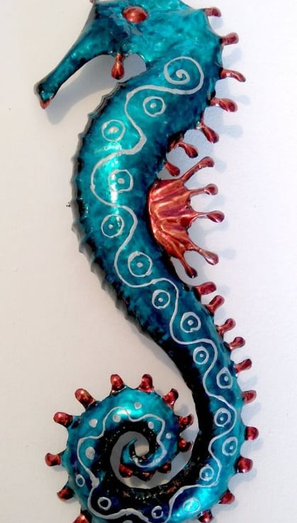 Handmade Seahorse Turquoise and Red, Metal Wall Art. Made from a coffee tin.