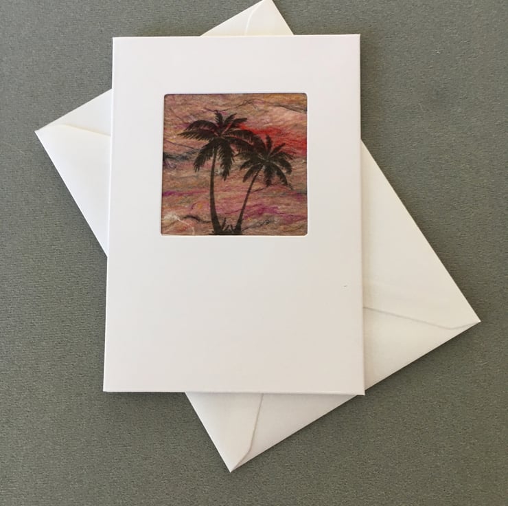This white card has a square aperture measuring 6cm x 6cm into which has been mounted a lovely silhouette picture. The background of the picture has been made using a piece of hand made silk paper using silk fibres, giving a beautiful array of colours onto which a silhouette of two palm trees has been printed. Due to the hand made nature of the silk paper, each card is totally unique. The card measures approximately 15cm x 10cm (6" x 4").