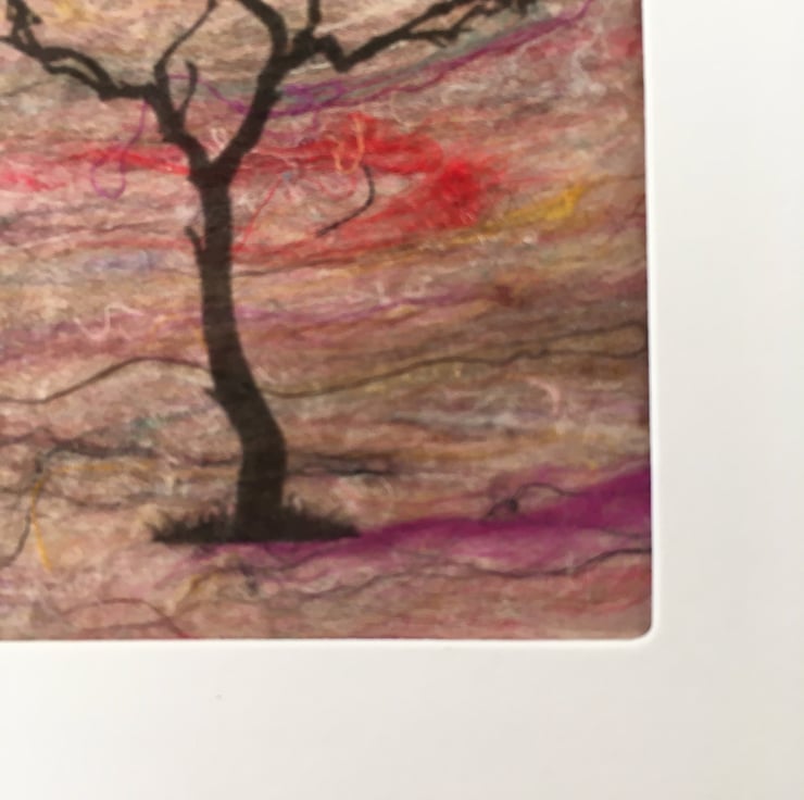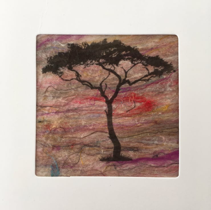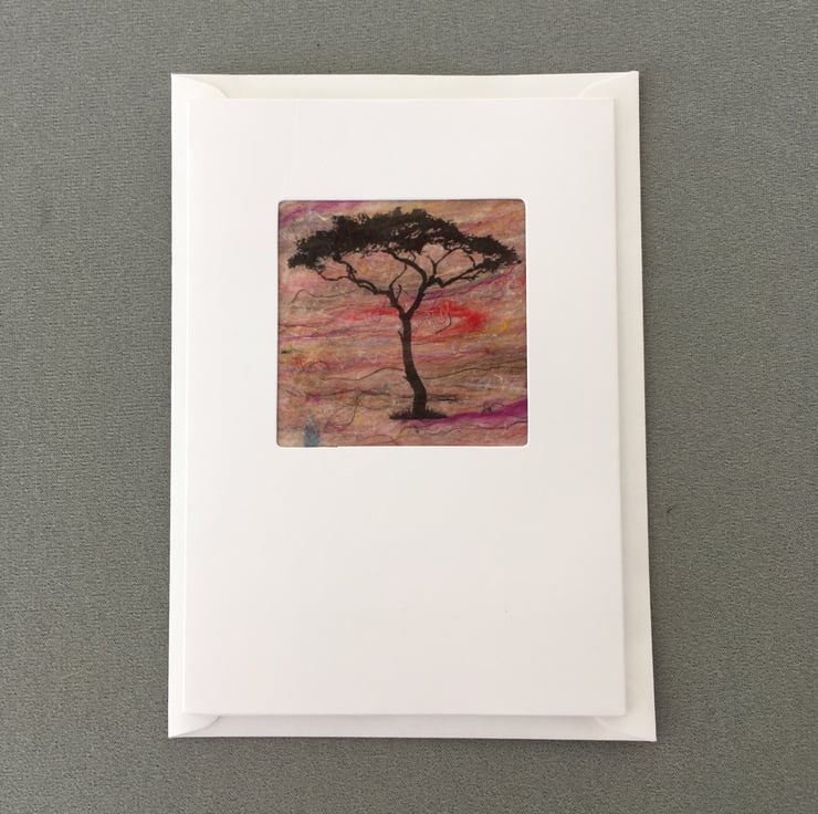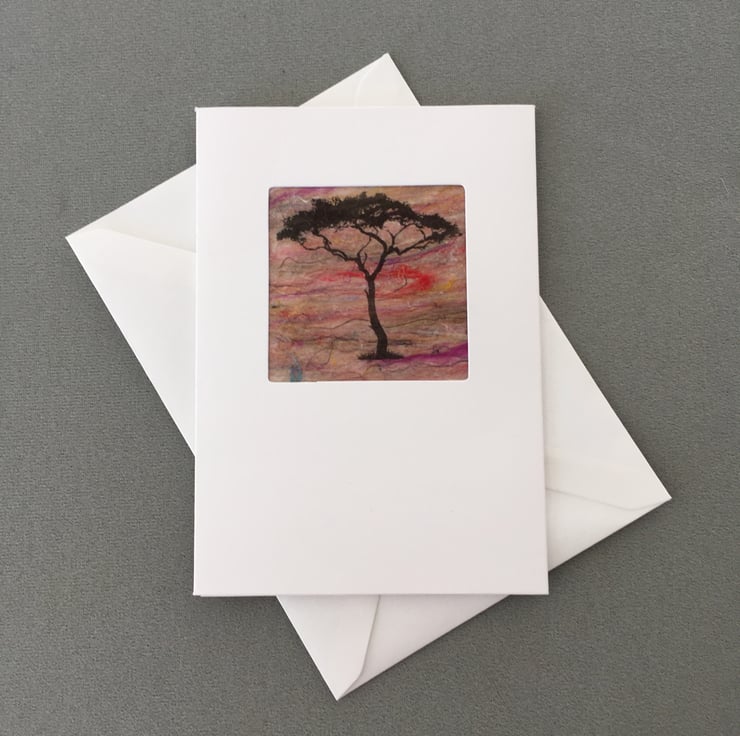 A lovely greetings card, suitable for any occasion. A piece of hand made silk paper made using silk fibres in a beautiful array of colours has been used for the background. A striking silhouette of a tree has been printed onto the silk paper and it has been mounted into a white aperture card. The aperture measures approximately 6cm x 6cm. Due to the hand made nature of the silk paper, each card is totally unique. The card measures approximately 15cm x 10cm (6" x 4").