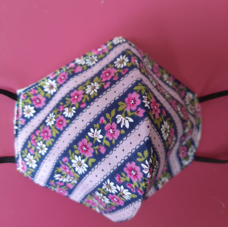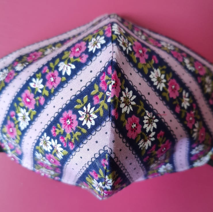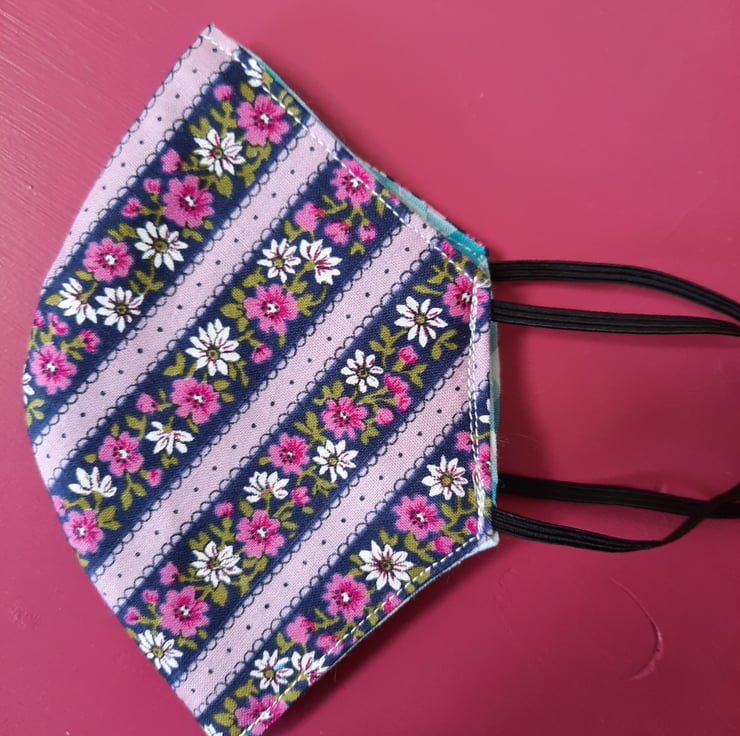 Gorgeous vintage-style floral fabric in lilac, deep blue and pink makes this a stunning handmade reusable facemask, contoured for a comfortable fit. Fully lined and with a filter pocket (filter not included) and elastic loops. This is not medical grade PPE.