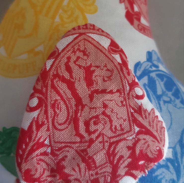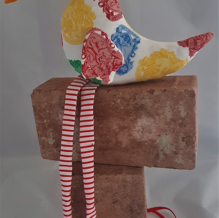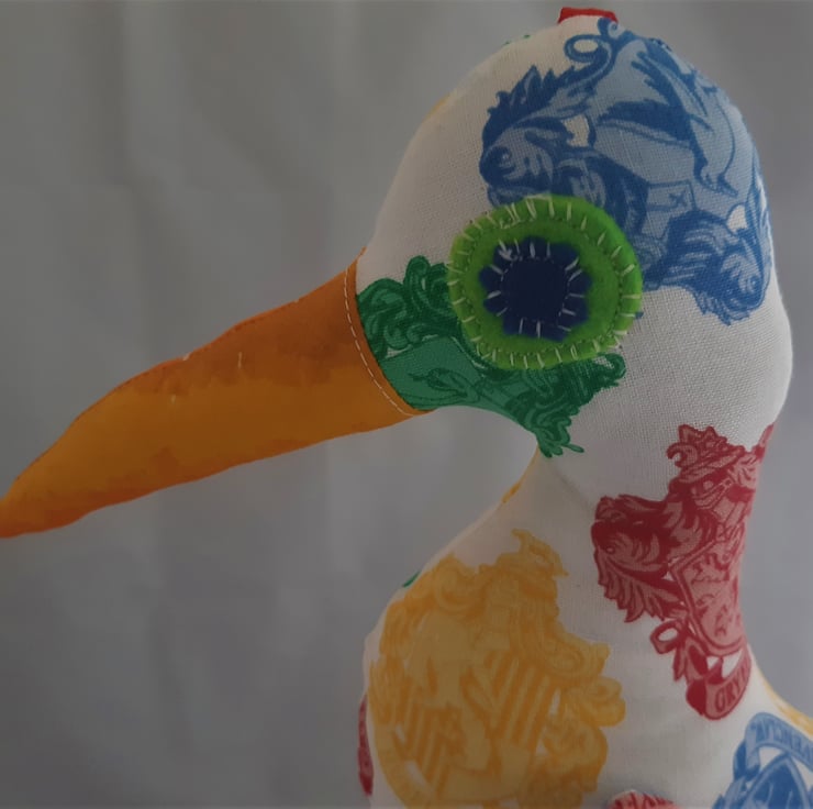 The ideal gift for the new parents who are Harry Potter fans. This hanging stork is made from a quirky and bright fabric featuring the badges of each of the Harry Potter houses. This fabric is complimented with stripey long dangling legs and yellow beak. The positioning of the easily adjustable cord means that this stork/bird looks great hanging from a wall or ceiling or light. The eyes are felt and are securely fastened to the body.