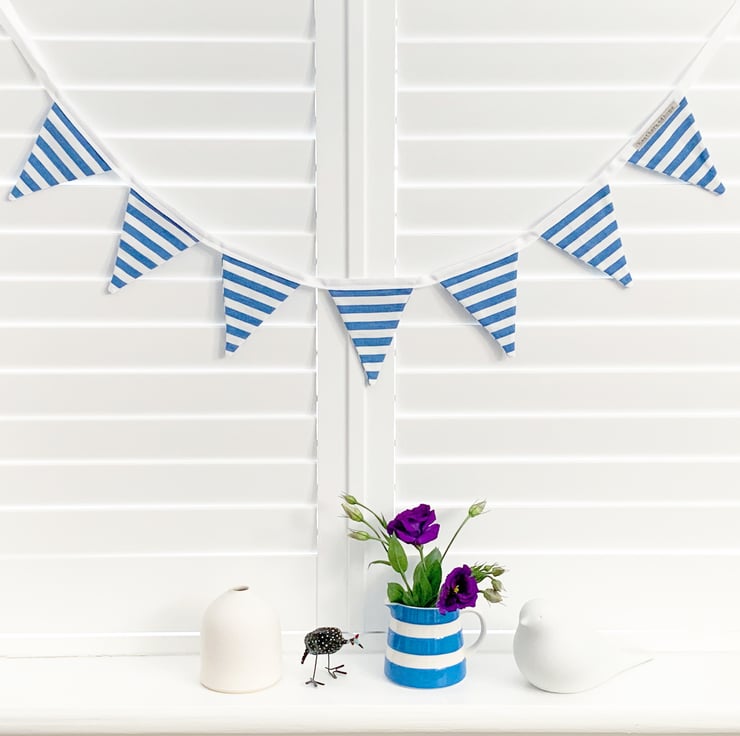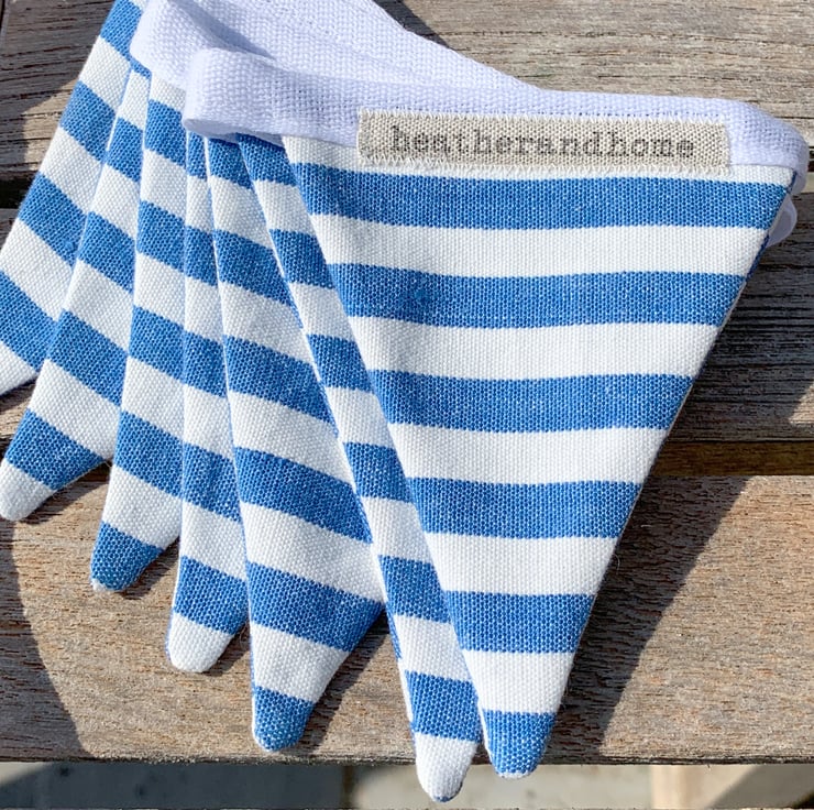 Made from superior quality blue and white woven cotton, the bunting comprises seven double-sided flags securely sewn onto white cotton tape. Finished with a 'heatherandhome' linen label.