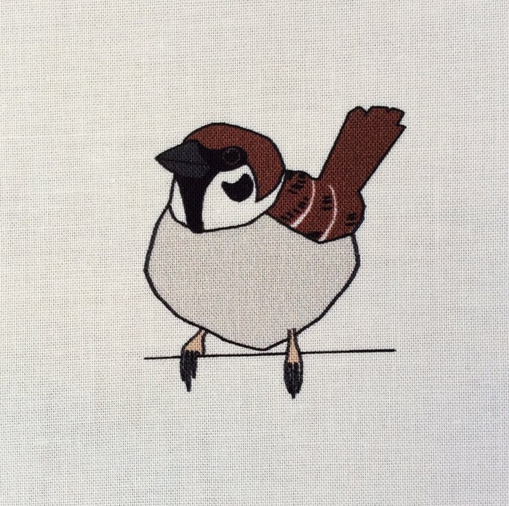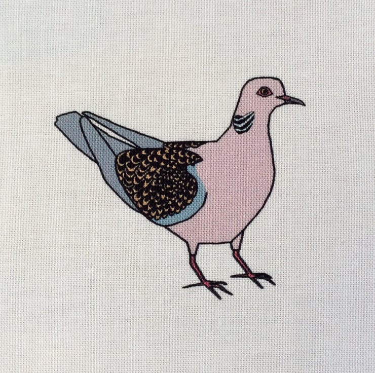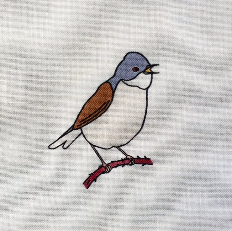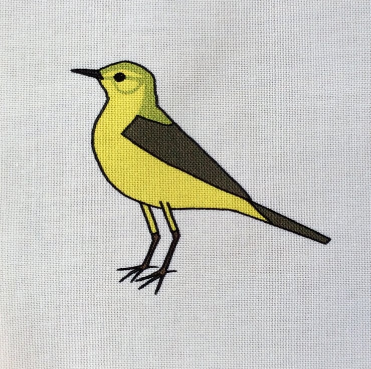 A fabric strip depicting birds found in Britain during the summer - swallow, skylark, mistle thrush, stonechat, cornbunting, tree sparrow, turtle dove, whitethroat and yellow wagtail.