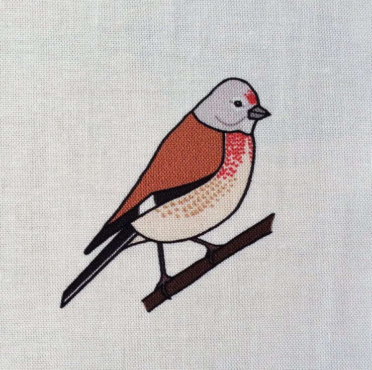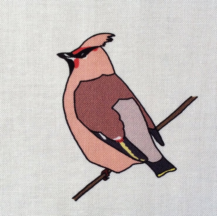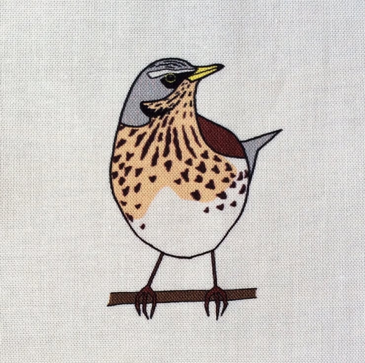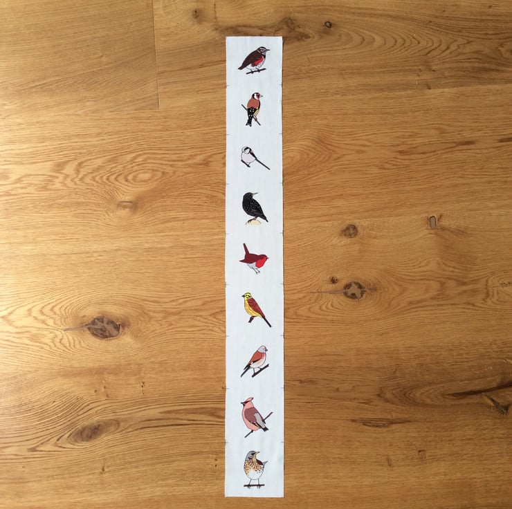 A fabric strip depicting birds found in a British hedgerow during the winter: redwing, goldfinch, long-tailed tit, starling, robin, yellow hammer, linnet, waxwing and fieldfare.