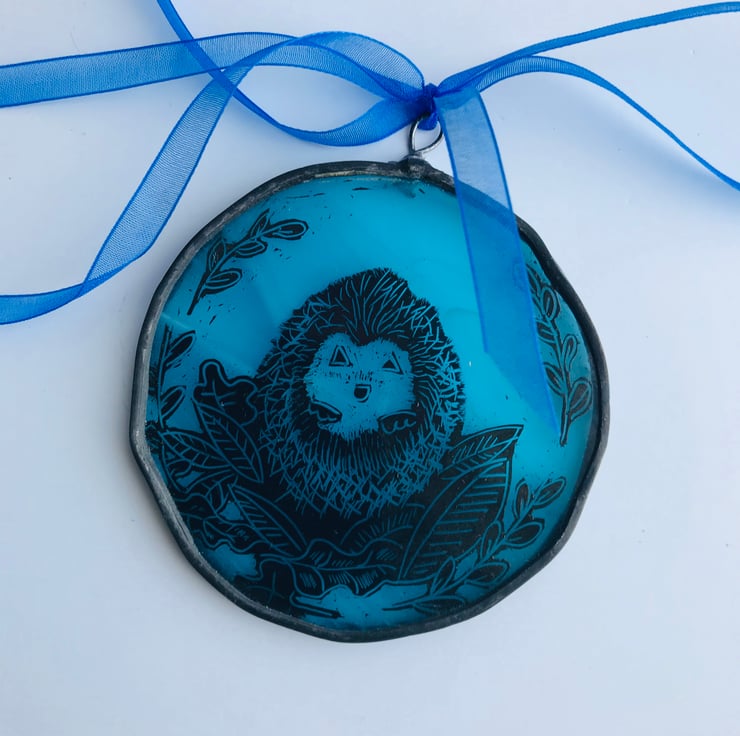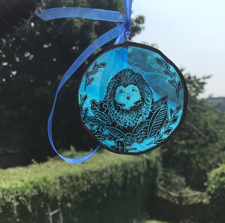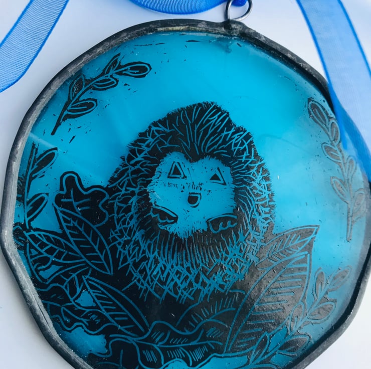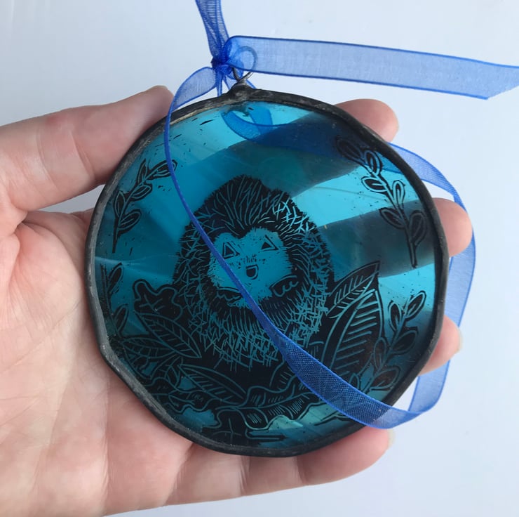 This blue stained glass sun catcher features a cute, sleepy hedgehog. This is a lovely gift for a nature lover or anyone who loves hedgehogs.