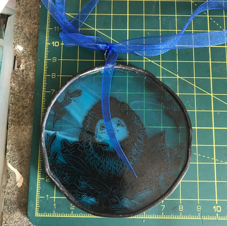 There are many stages for making a stained glass panel so I’ll keep it brief :) I begin by drawing up the design then hand cut the piece of glass I’ll be using. Next I mix and apply the paint and then place the glass in a kiln and fire it. Once cooled the glass is leaded and the joins soldered before I use cement to keep the glass and lead correctly in place. It is left over night before removing excess cement and cleaning the panel. Finally I make and solder on the hanging loops.