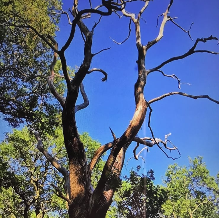 Wanting to capture the beauty of the contrast and harsh light between the jagged branches against the blue summer sky.