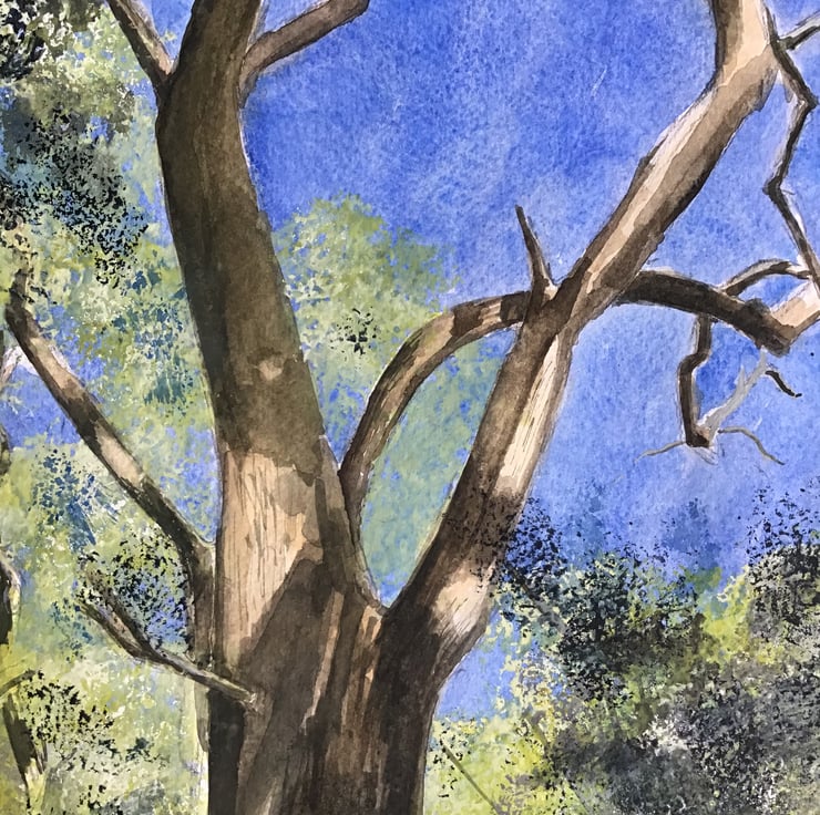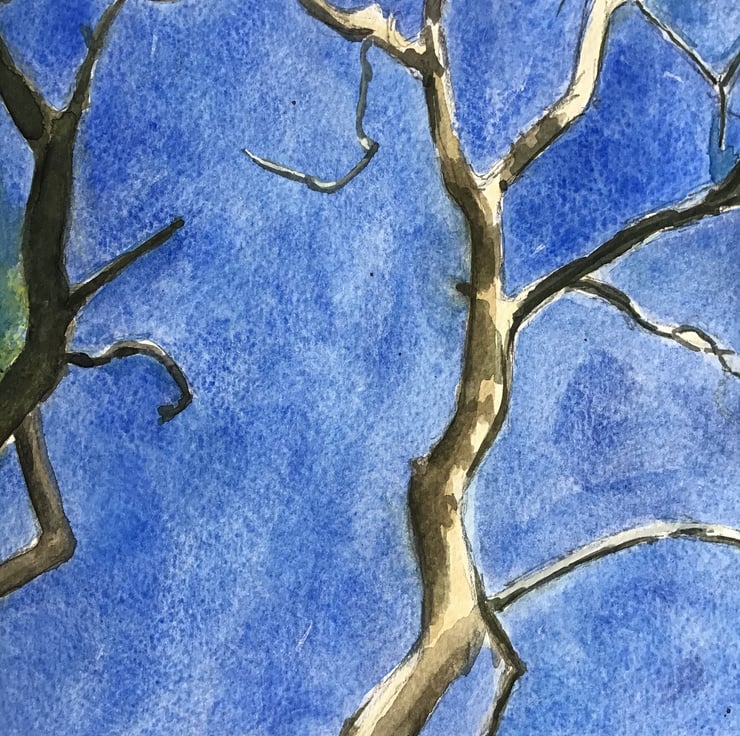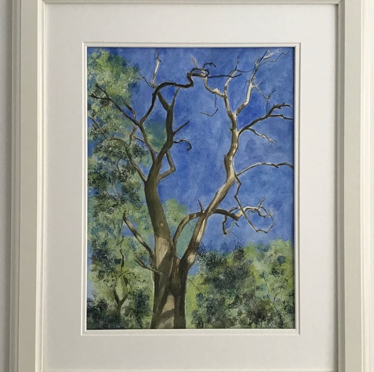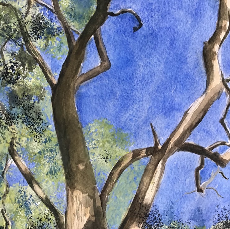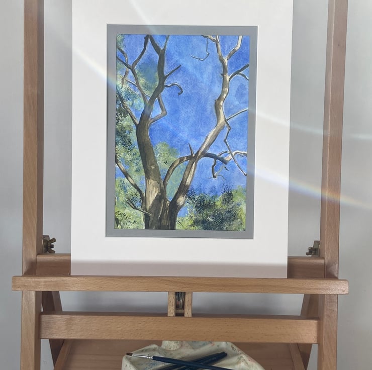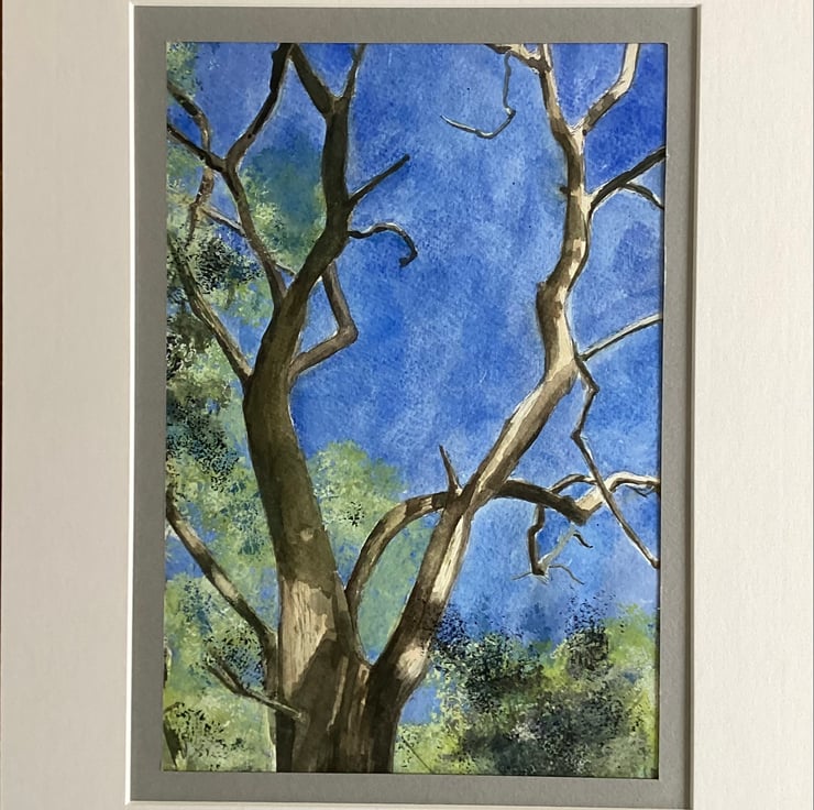 Original watercolour painting of the leafless, jagged, branches of a tree, reaching high and contrasting against the intense blue sky. Measuring A3 in size (420mm x 297mm). Sold mounted but not framed.