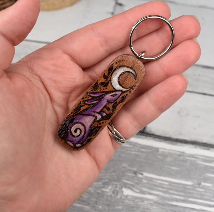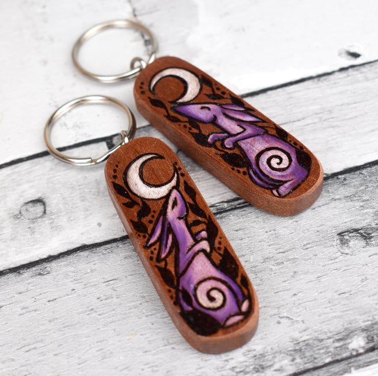 A sapele mahogany wood keyring with a purple moongazing hare created by hand using pyrography, then coloured with Caran d'ache pencils.