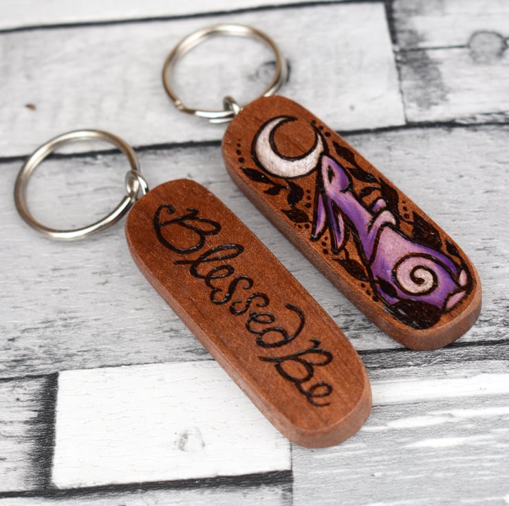 All my creations are my own design and composition. Each piece is unique. Please note, wood is a natural material and each piece has it's own knots and imperfections that make it beautiful. To care for your piece; keep out of harsh weather and out of direct sunlight. Wood and pyrography age naturally over time. I've used a UV protector and clear lacquer to protect the keyrings but they are not indestructible.