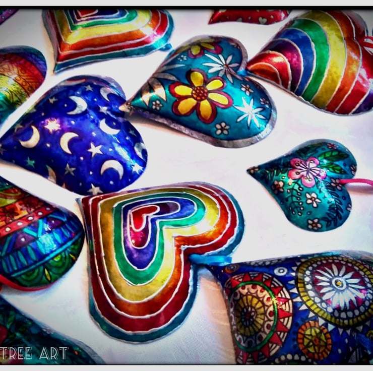 Tin Heart decoration.Turquoise with Daisy flowers. Handmade. Made from a Coffee tin by Claire Perry.