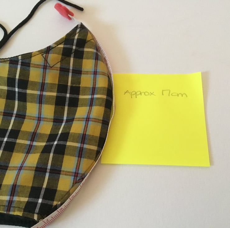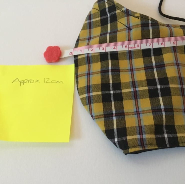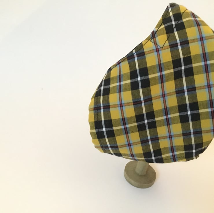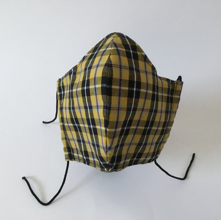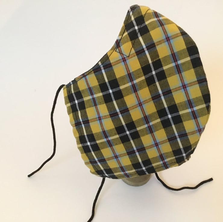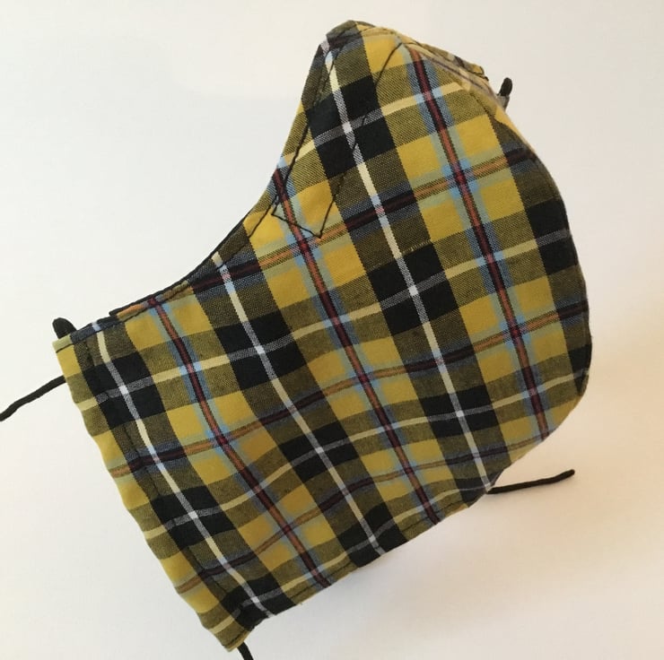 Cornish Tartan Face Covering With 3 layers of cotton, in the Gold and Black small tartan. Liberty Tana Lawn black lining. There is a removable nose wire which should be removed before washing and elastic ear loops with 35 cm each side for you to adjust to size.