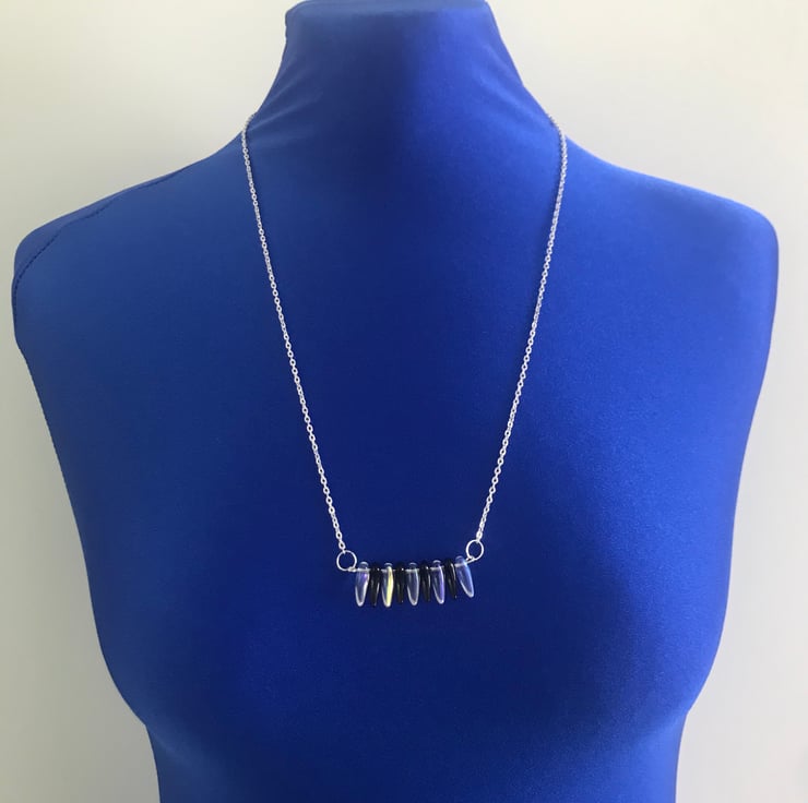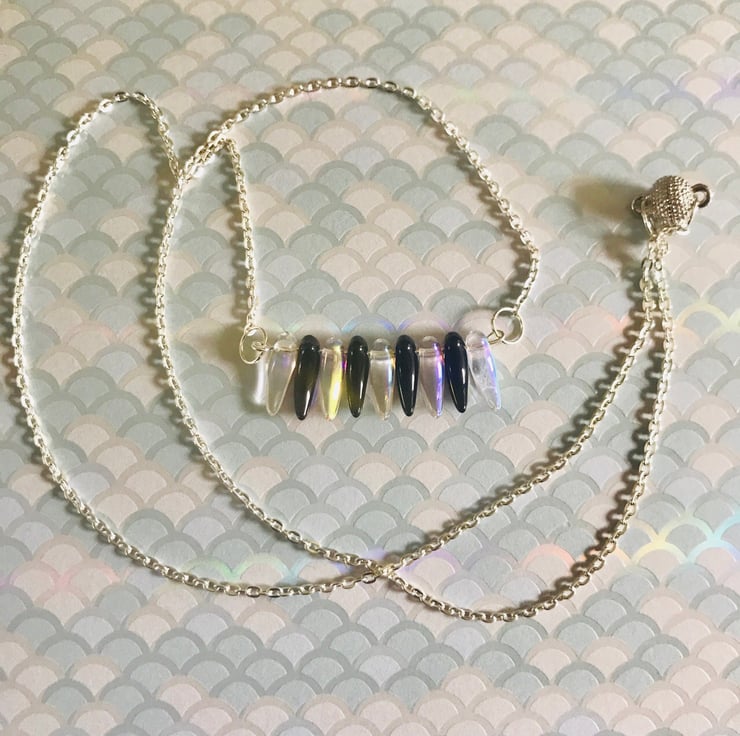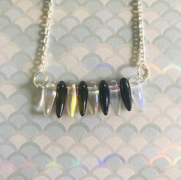 Beaded shark tooth pendant necklace. Made with acrylic clear ab & black, acrylic shark tooth shaped beads. 24 inch chain with lobster clasp.