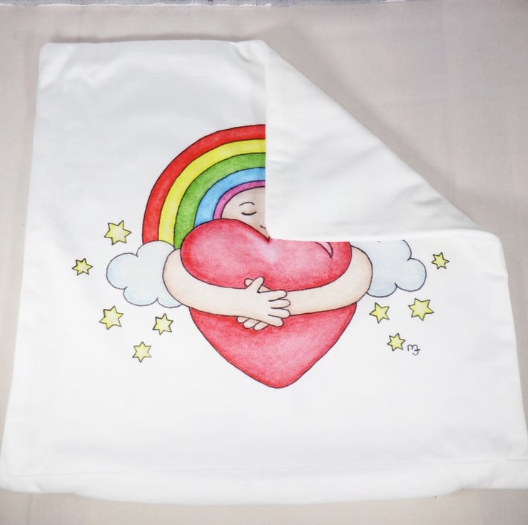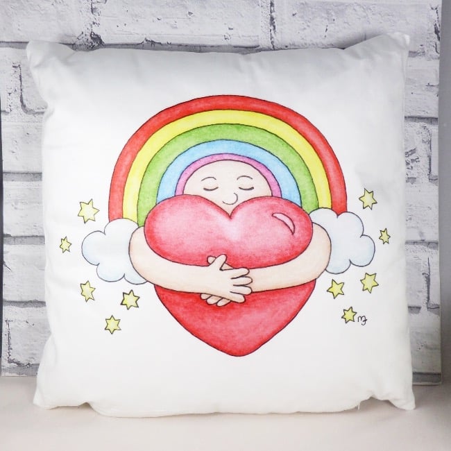 The cushion cover features my original Rainbow Hug artwork, professionally printed to the highest standards. Available with or without the cushion inner, please choose your option.