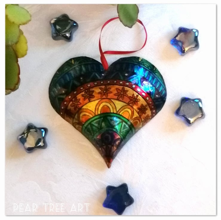 This Tin Heart decoration has been cut out of a coffee tin and embossed into shape using hammers and hand painted.