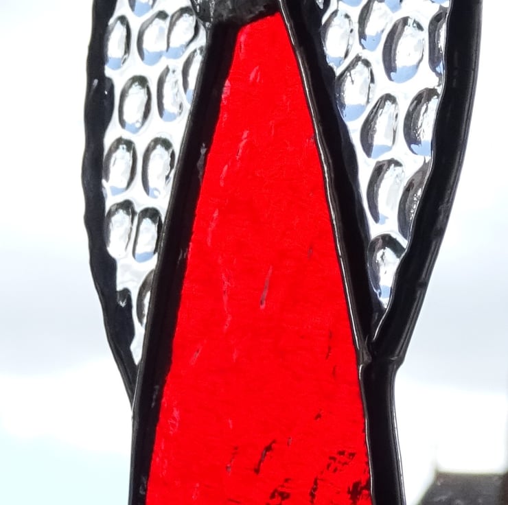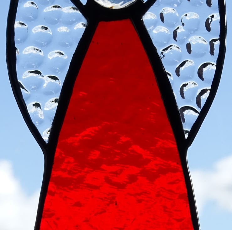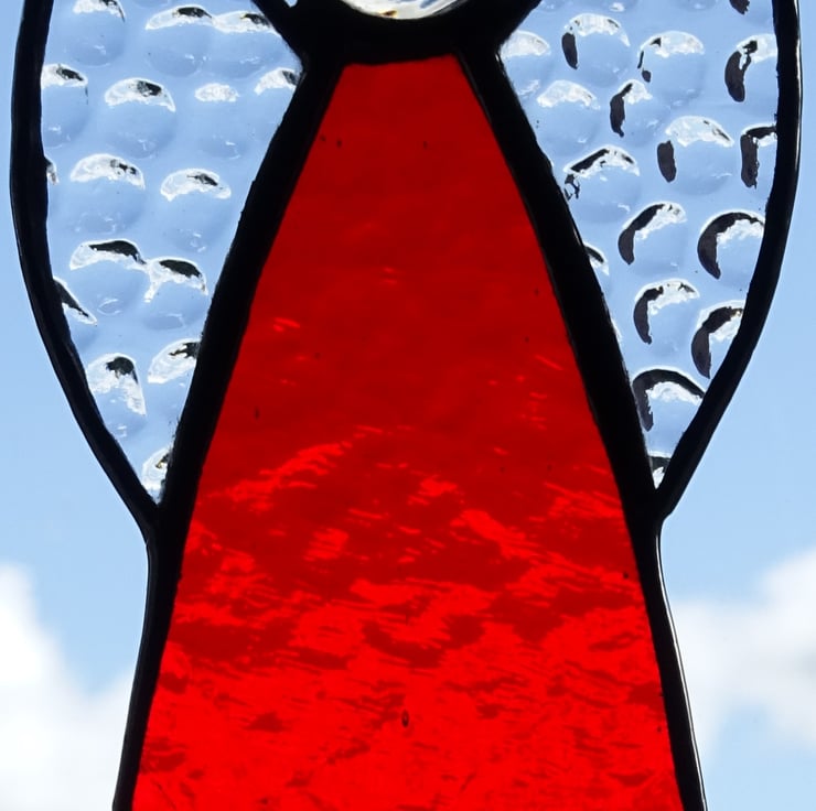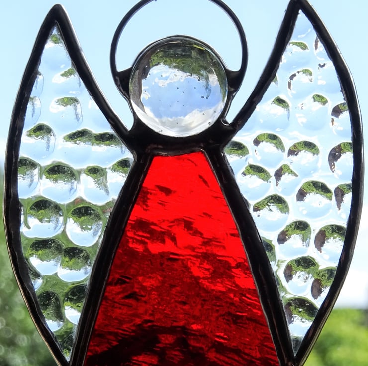 Our stained glass angel is hand-crafted using English Muffle glass in Red with clear textured wings. It will look great hanging where the light can catch it or on a Christmas Tree. Each piece of glass is cut by hand and the edges of the glass are wrapped in copper foil which is burnished to the glass. The pieces are soldered together with fine beaded solder line and then topped with a glass globule and halo. The finished angel is polished and a hand tied loop is added so that it is ready to hang in your chosen place.