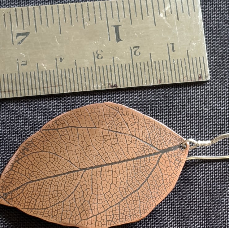 These realistic copper leaves are made from copper sheet, then I roll the copper with a skeleton leaf which gives an imprint of the leaf into the copper.