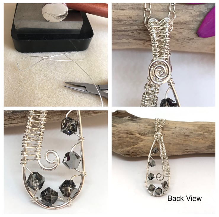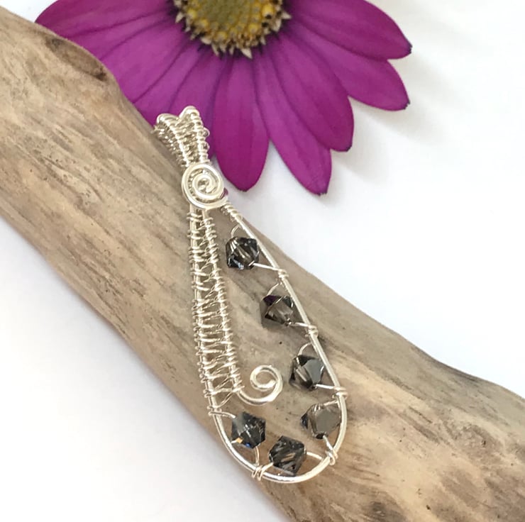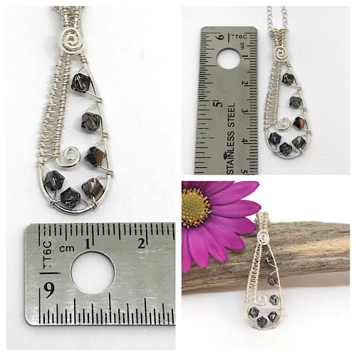 I have formed sterling silver wire into a teardrop shape and created a wire weave design for the bail. The wire weave design continues along the left side and sparkling crystal bicone beads are wrapped around the base and right side of the pendant. Swirls of silver complete the design at the top and center of the pendant.